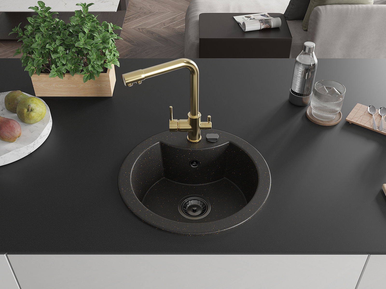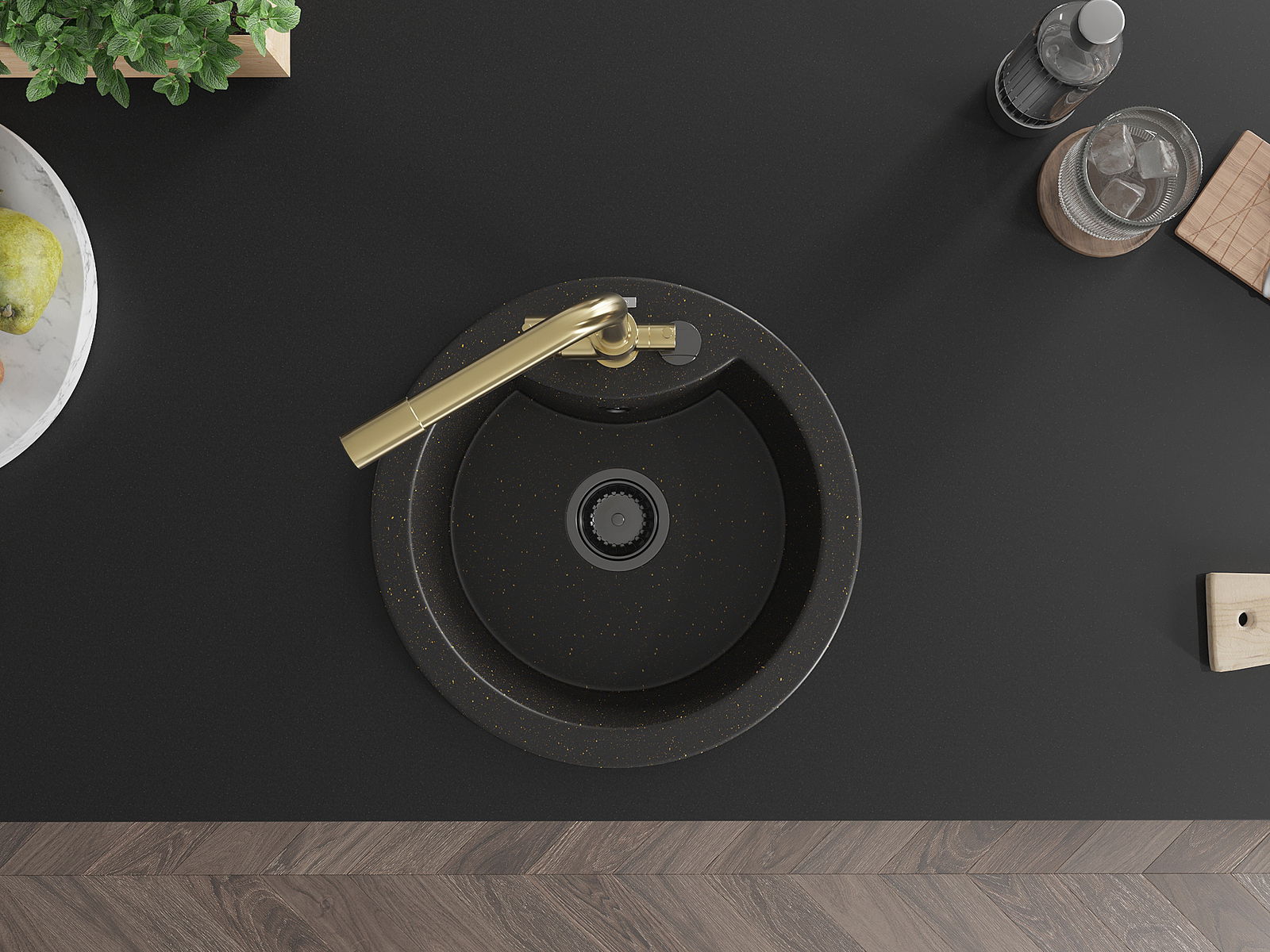 L'évier a un trou sous-meulé de 35 mm de diamètre à percer soi-même. Il peut être utilisé, entre autres, pour installer un distributeur de liquide, ce qui éliminera la présence de bouteilles en plastique dans la cuisine et lui donnera une finition élégante.