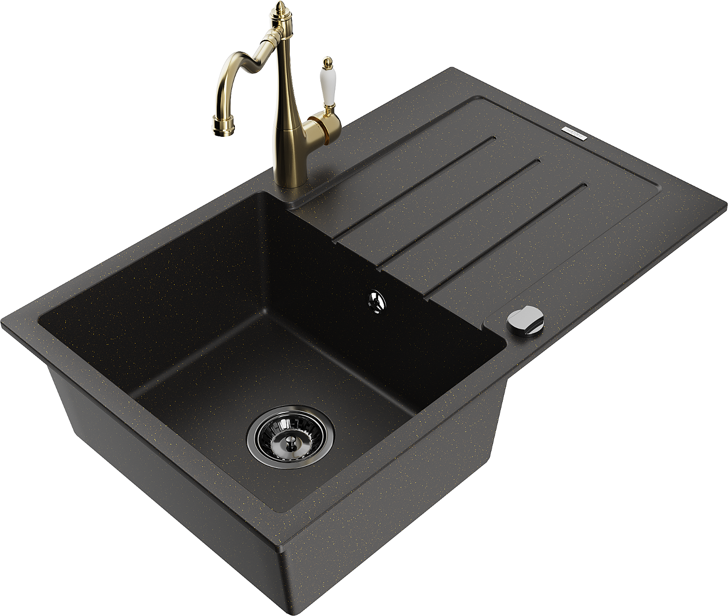 Mexen Bruno évier en granit 1 bac avec égouttoir et robinet de cuisine Carla, noir/doré métallique - 6513-75-670700-50-B