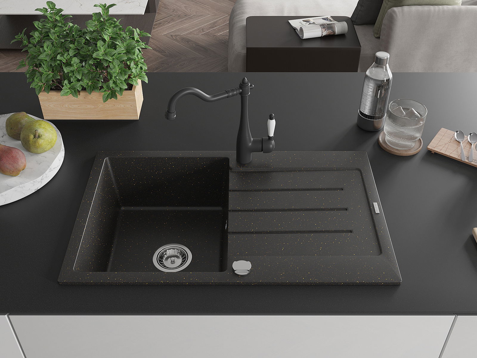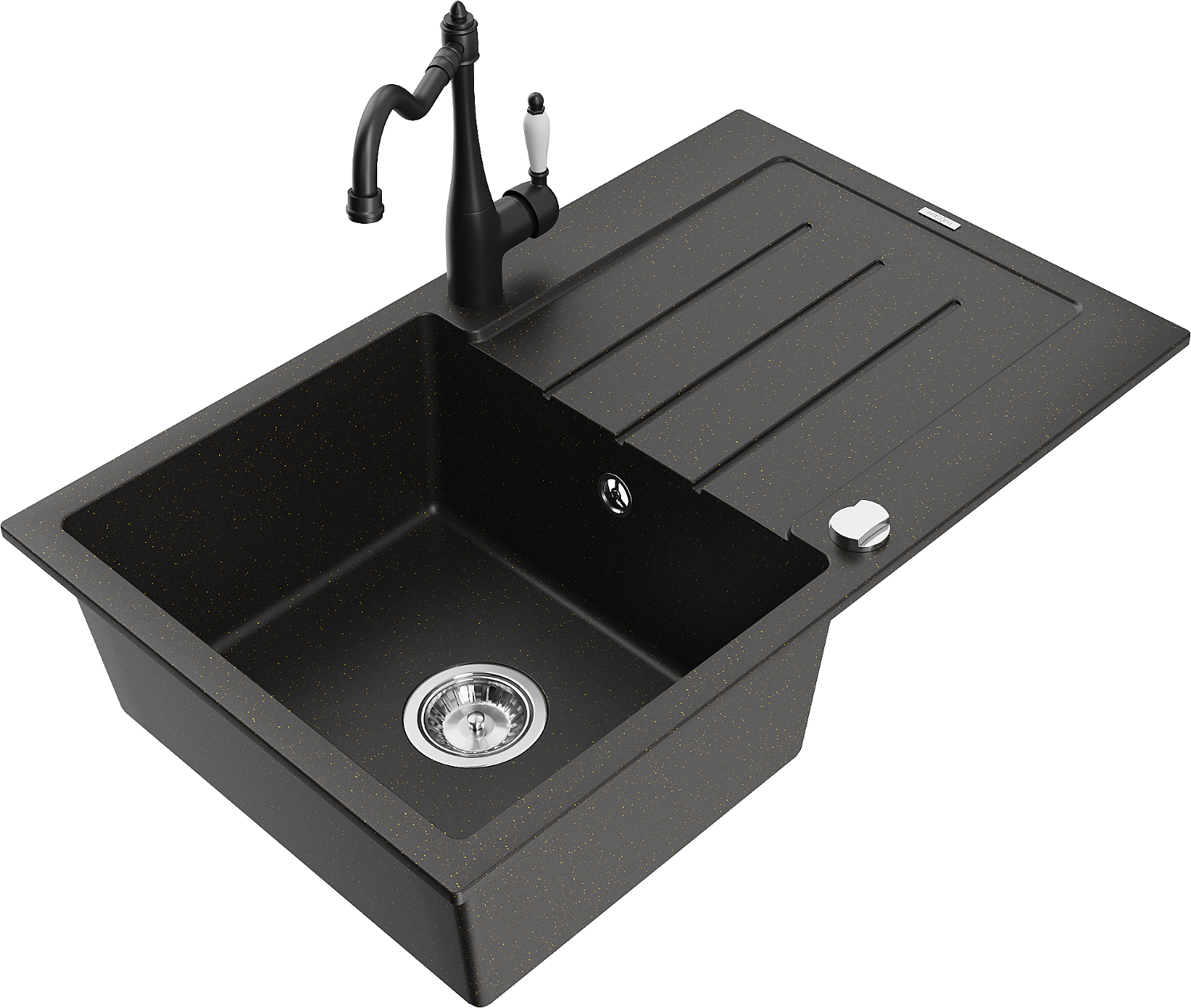 Mexen Bruno évier en granit 1 bac avec égouttoir et robinet de cuisine Carla, noir/or métallique - 6513-75-670700-70