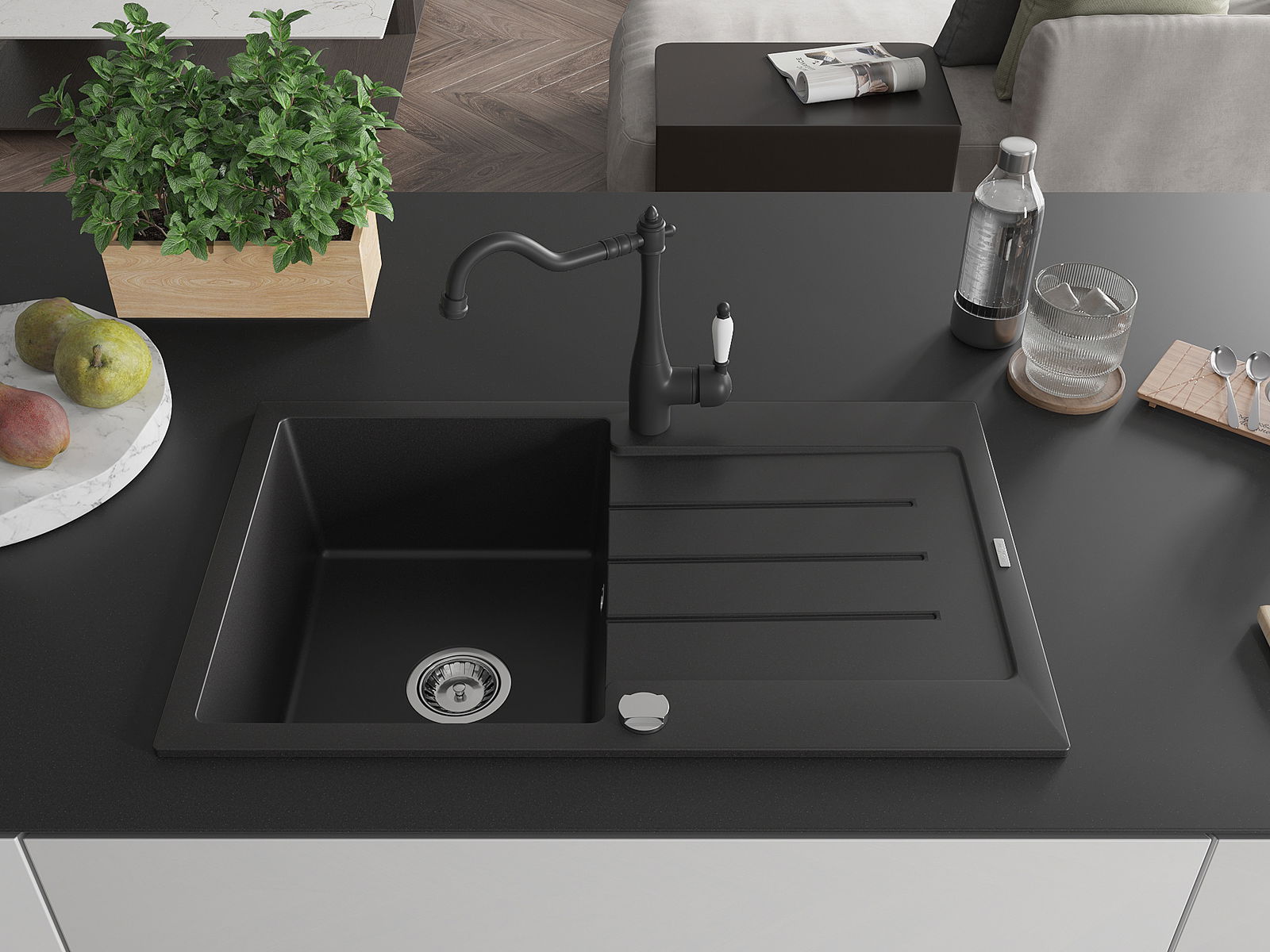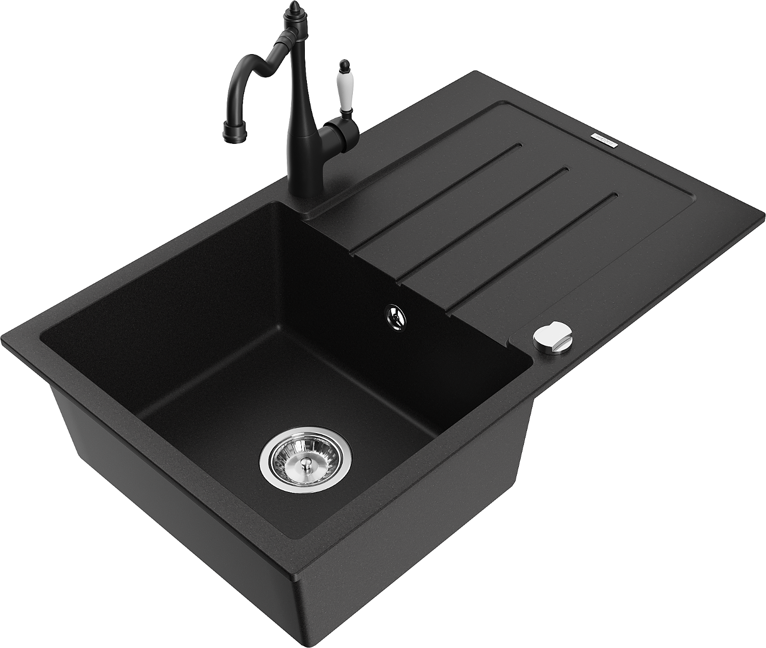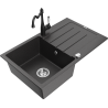 Mexen Bruno évier en granit 1 bac avec égouttoir et robinet de cuisine Carla, noir - 6513-77-670700-70