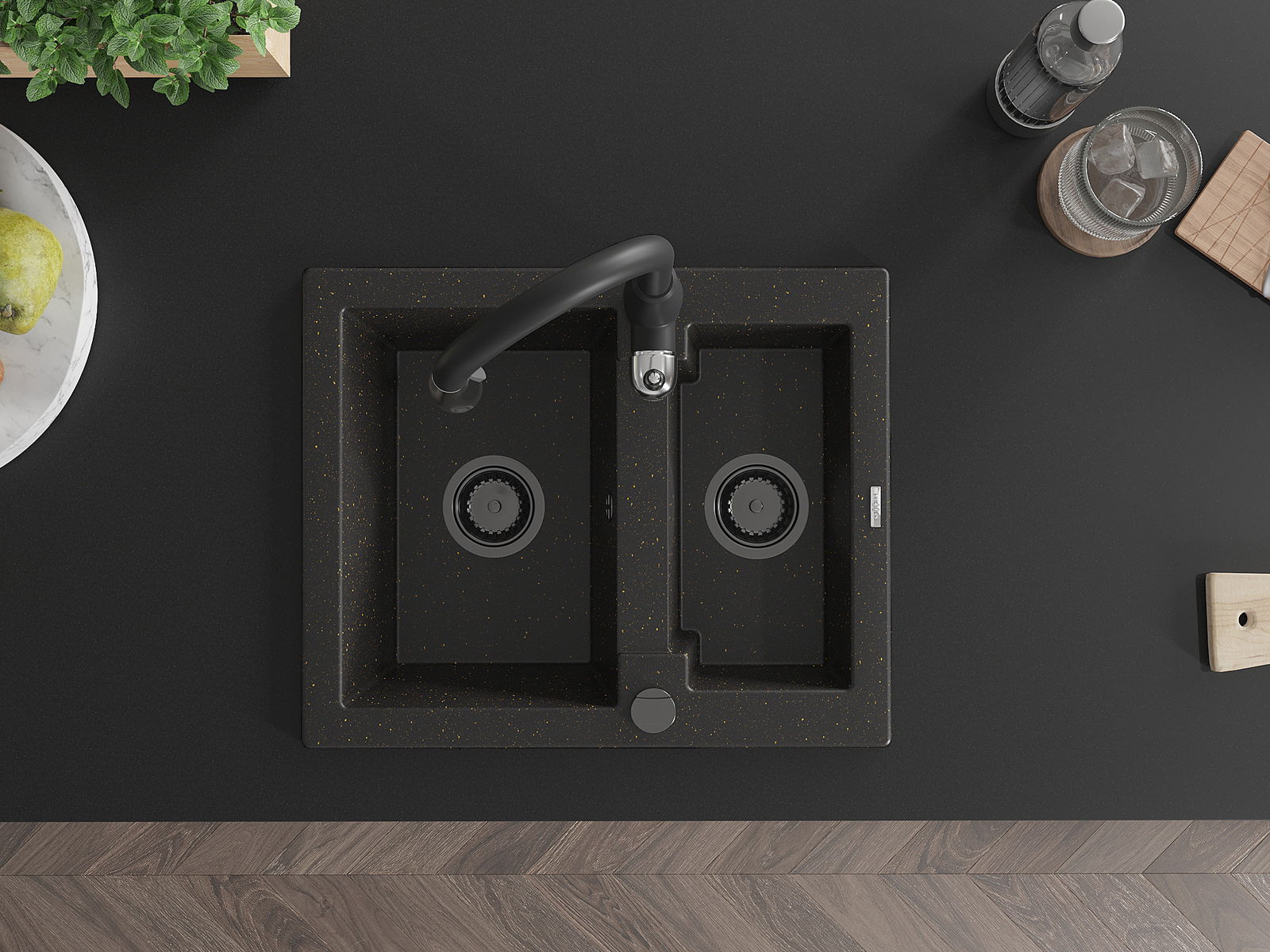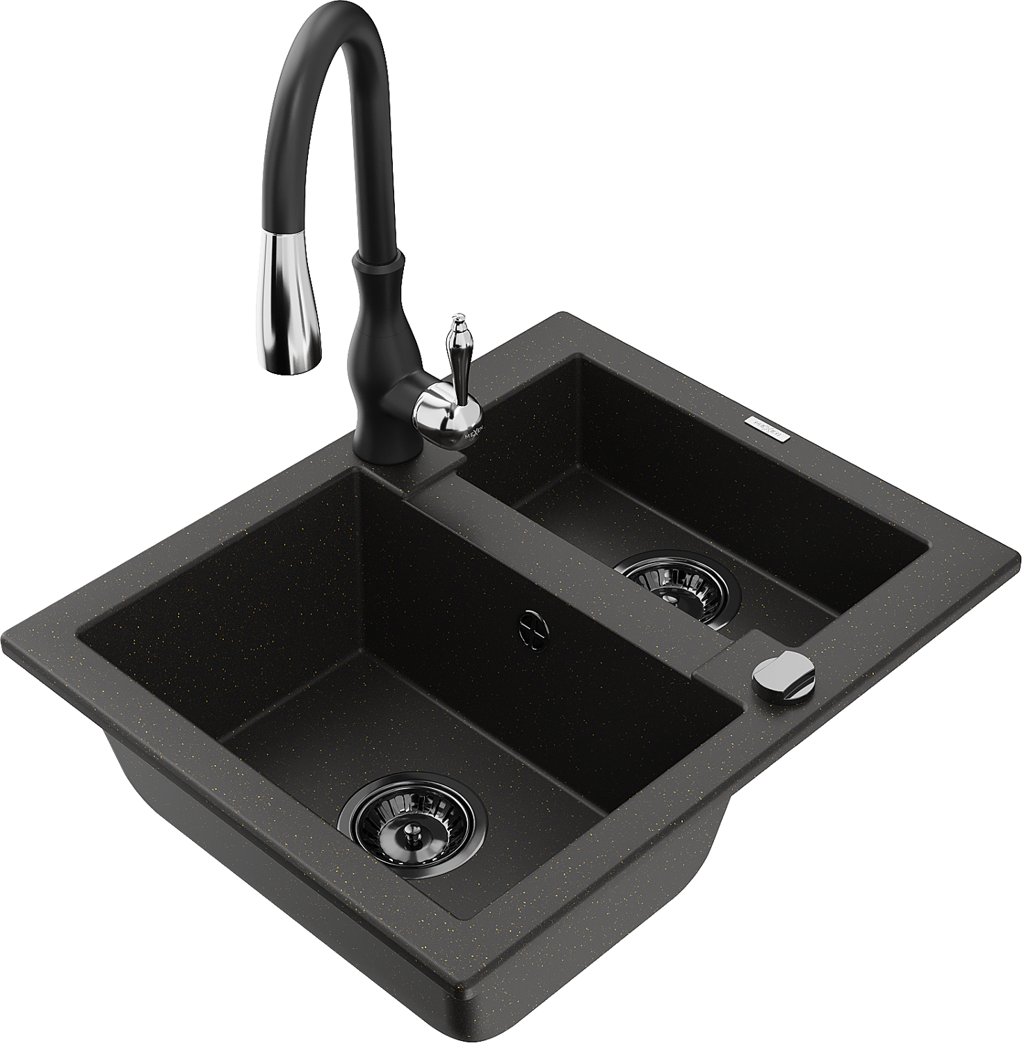 Mexen Carlos évier en granit 1,5 bac avec robinet de cuisine Savita, noir/or métallisé - 6518-75-672601-70-B
