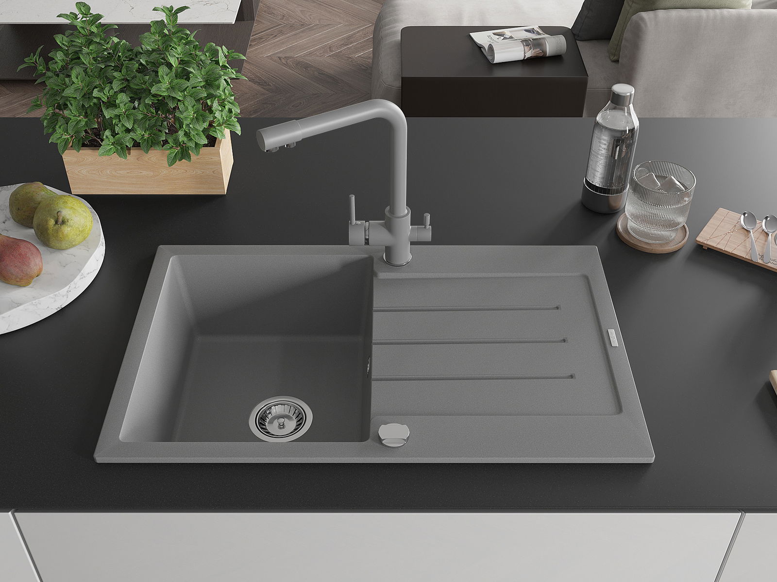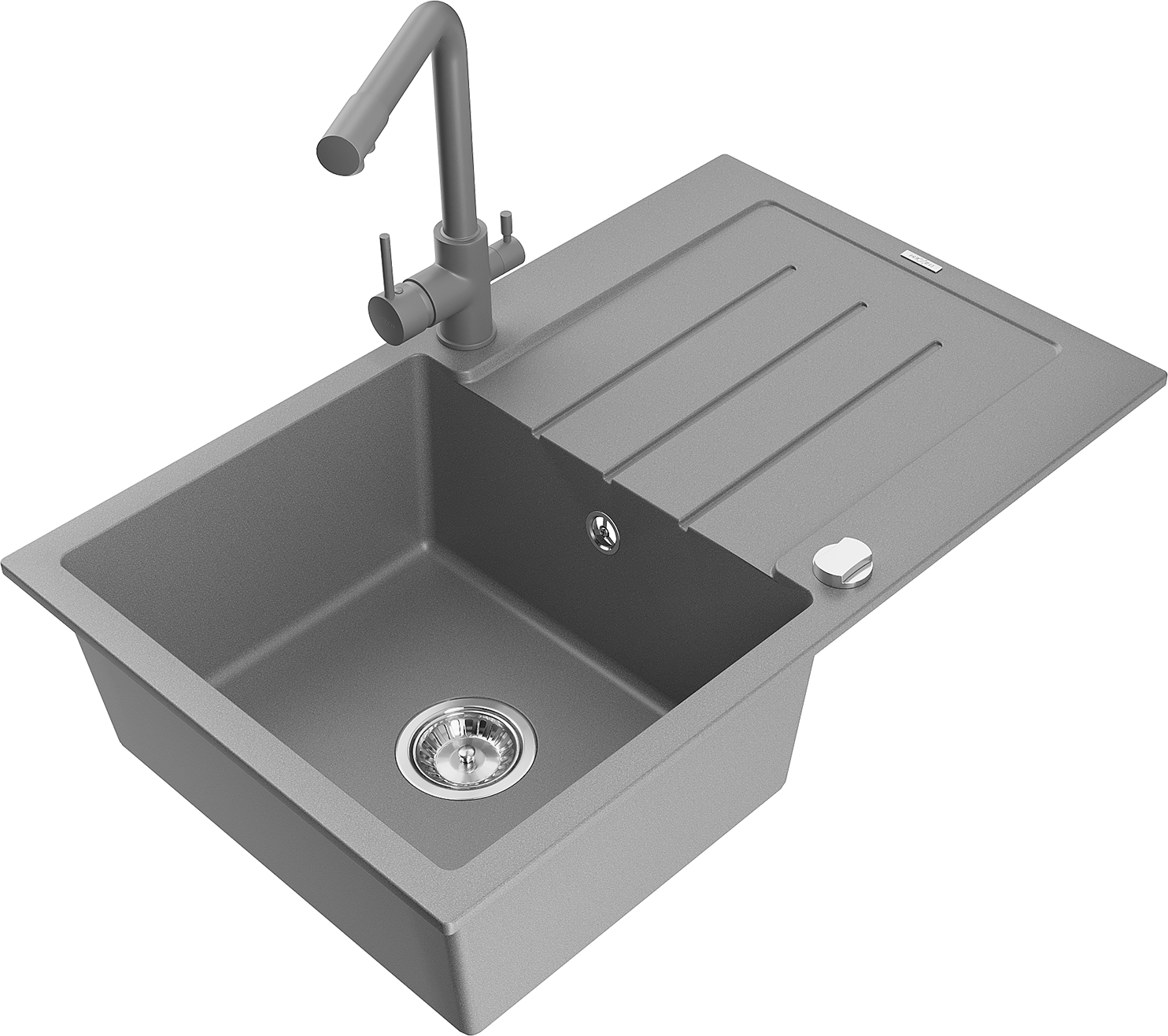 Mexen Bruno évier de cuisine en granit 1 bac avec égouttoir et robinet Duero, gris - 6513-71-671600-71