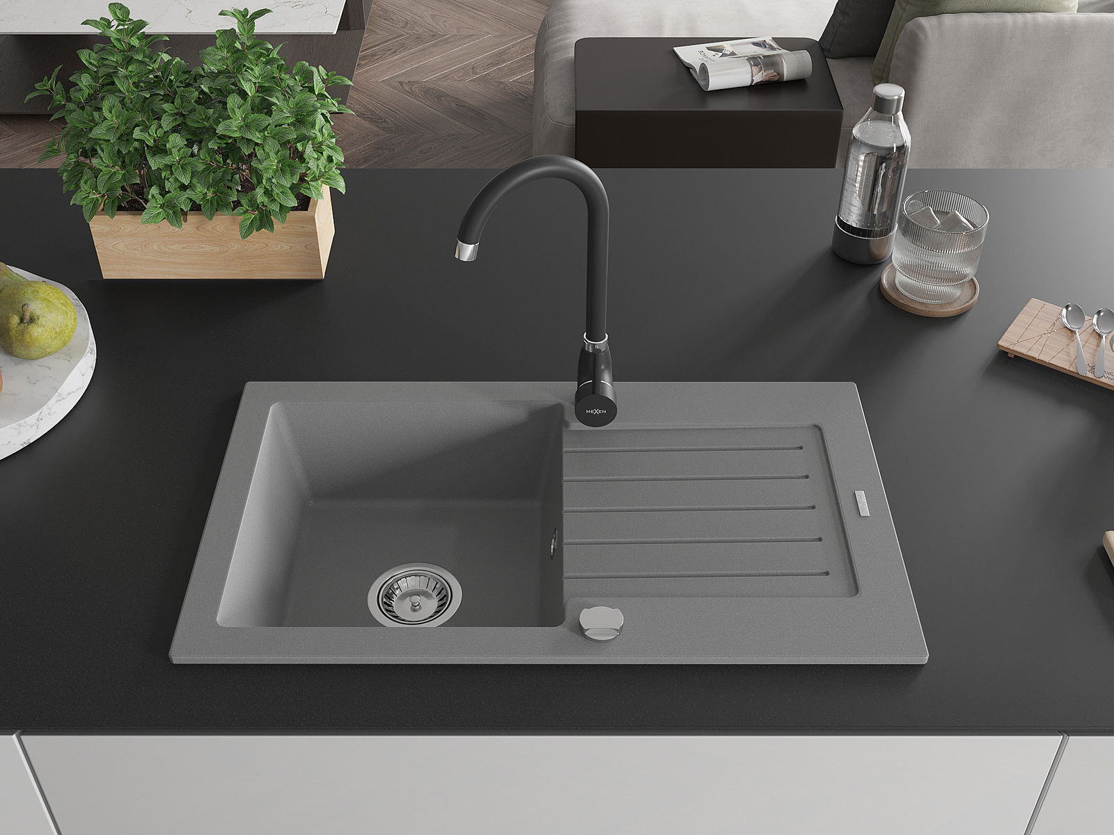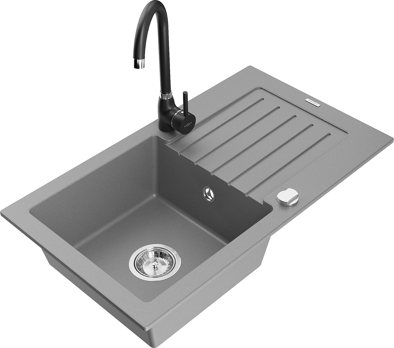 Mexen Pablo évier en granit 1 bac avec égouttoir et robinet de cuisine Telma, gris - 6510-71-670200-70