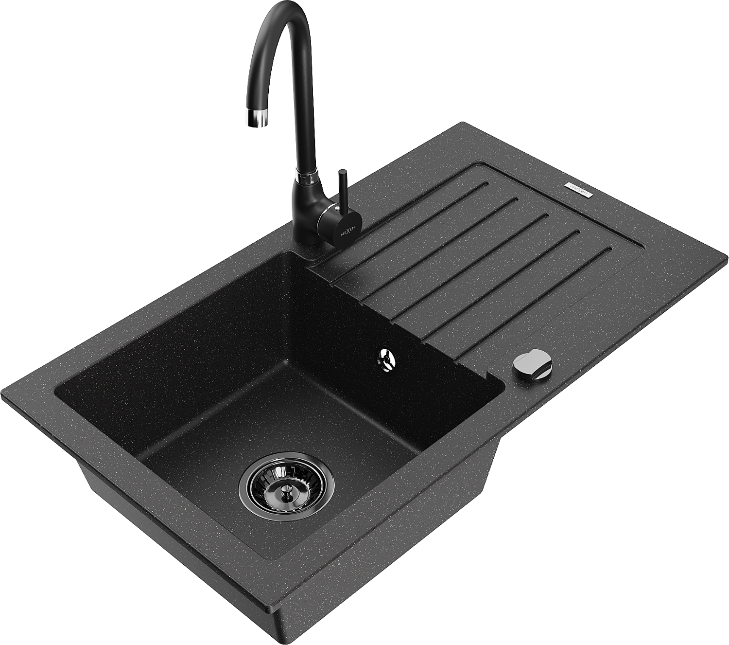 Mexen Pablo évier en granit 1 bac avec égouttoir et robinet de cuisine Telma, noir/argent - 6510-73-670200-70-B