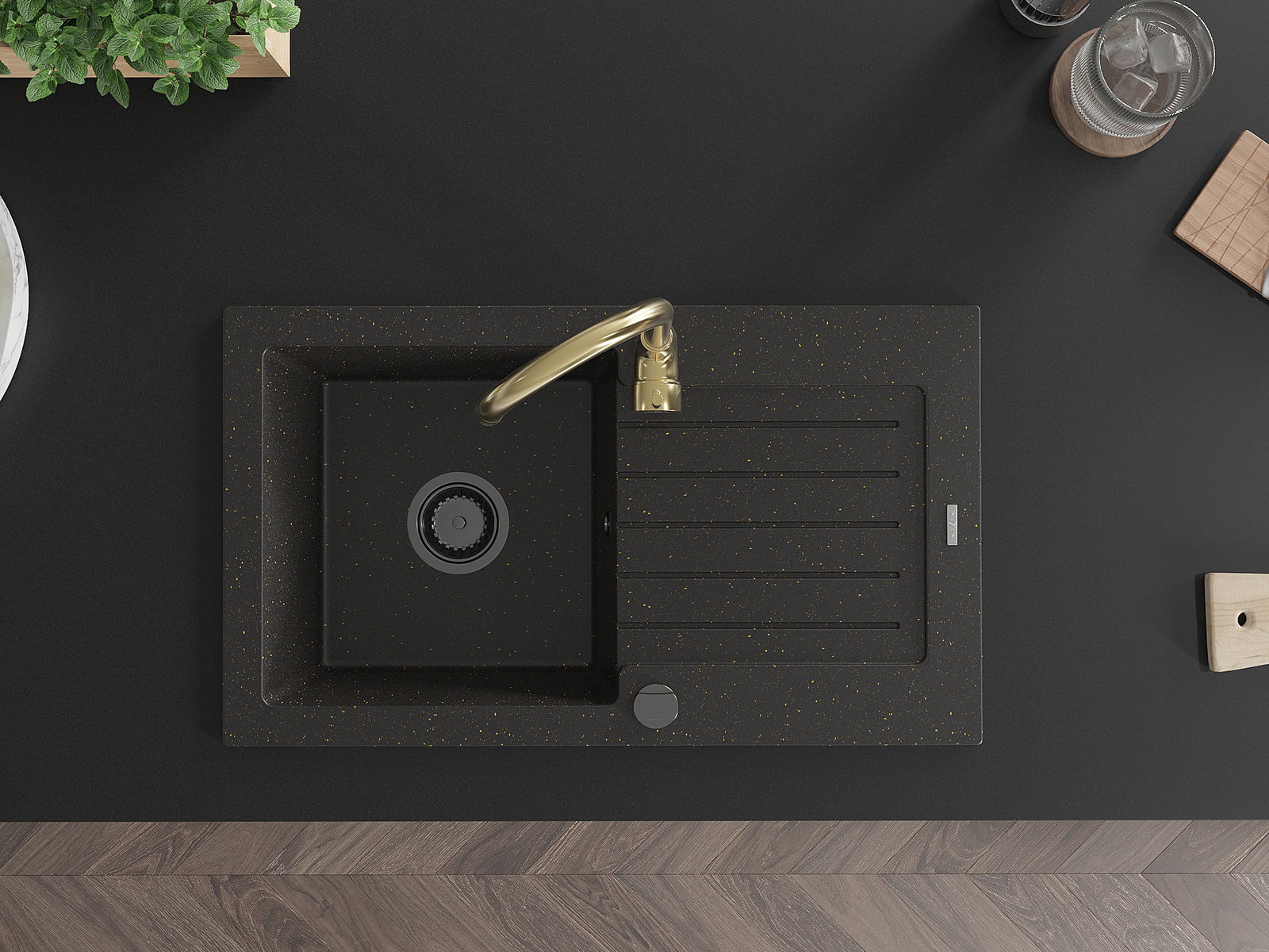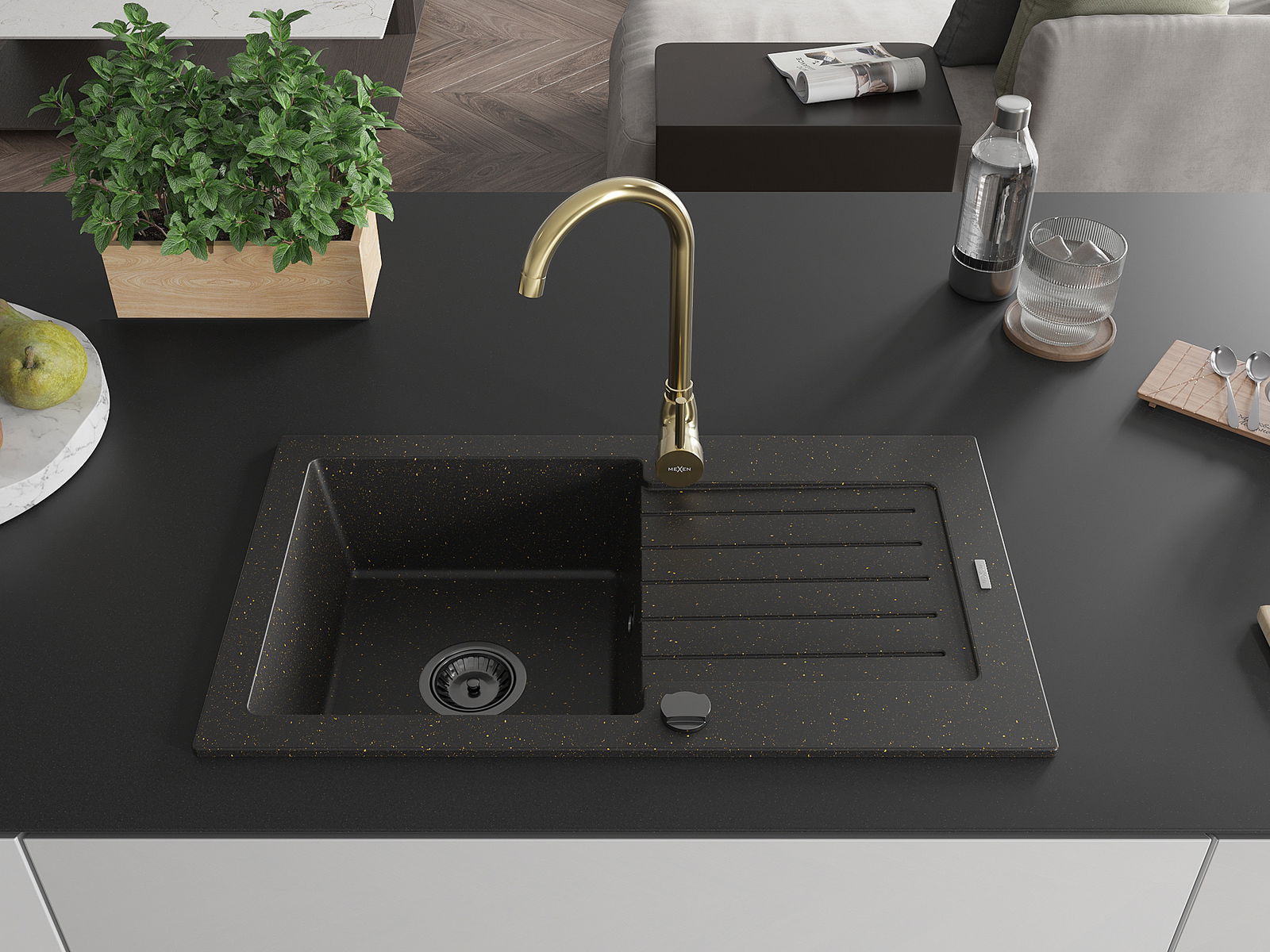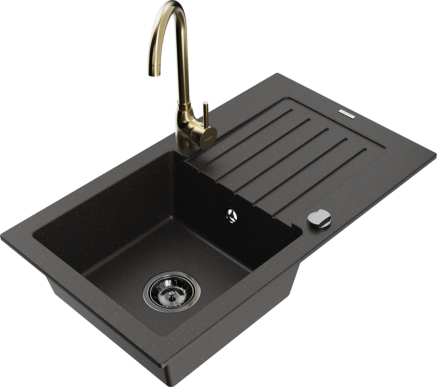 Mexen Pablo évier en granit 1 bac avec égouttoir et mitigeur de cuisine Telma, noir/or - 6510-75-670200-50-B