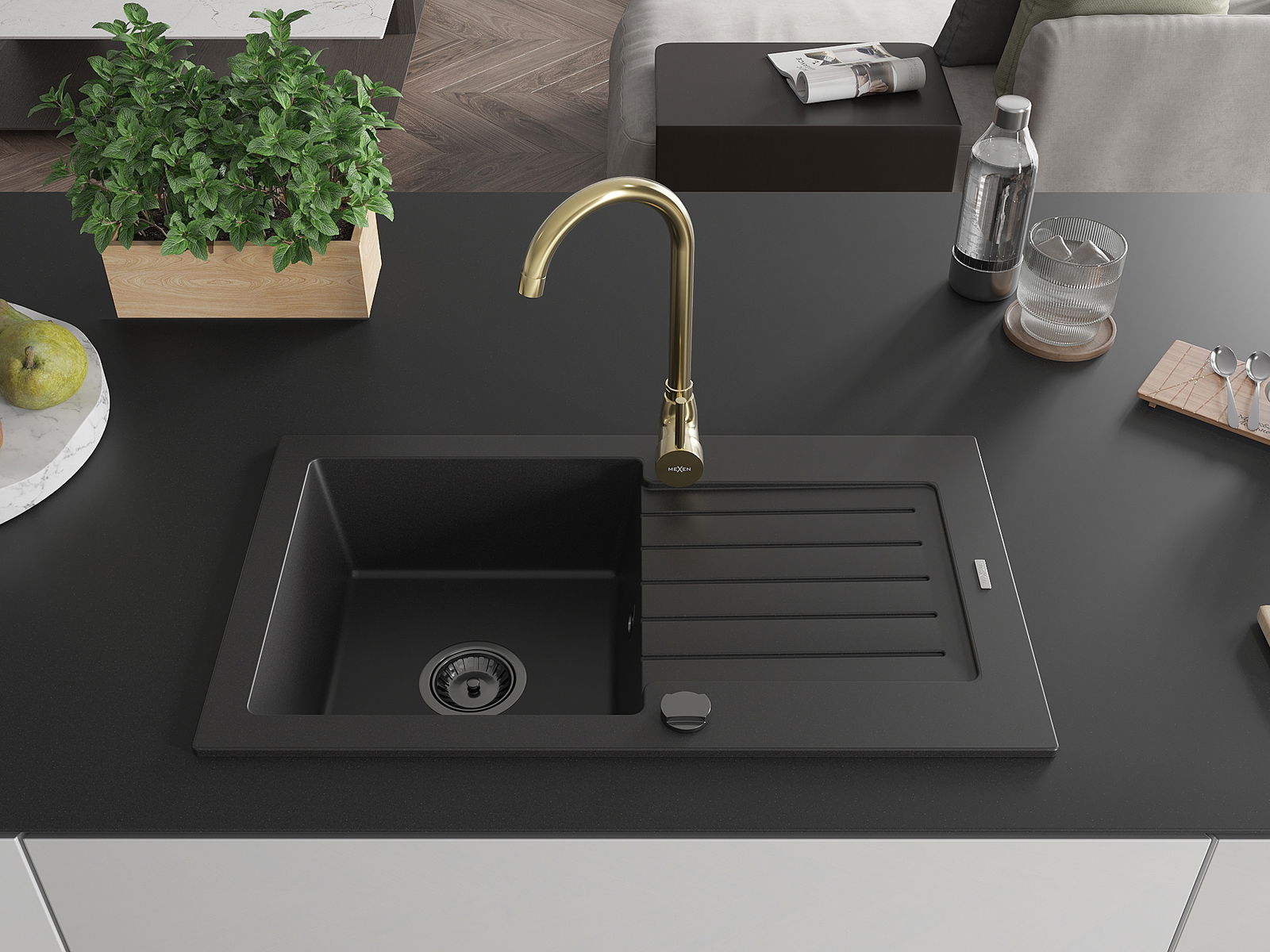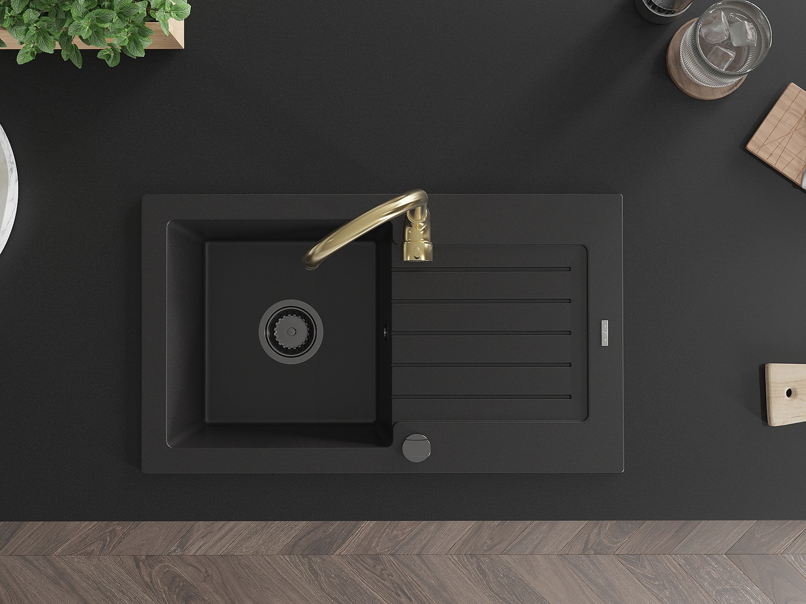 Mexen Pablo évier en granit 1 bac avec égouttoir et robinet de cuisine Telma, noir - 6510-77-670200-50-B