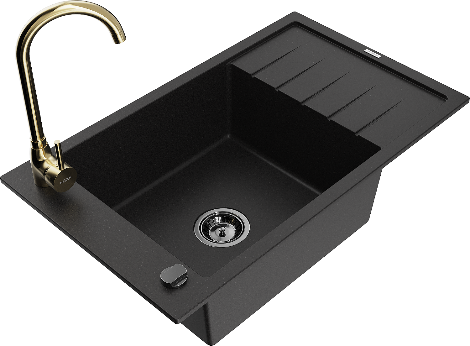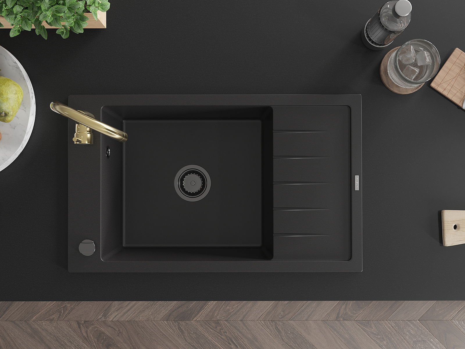 Mexen Elias évier en granit 1 bac avec égouttoir et mitigeur de cuisine Telma, noir - 6511-77-670200-50-B