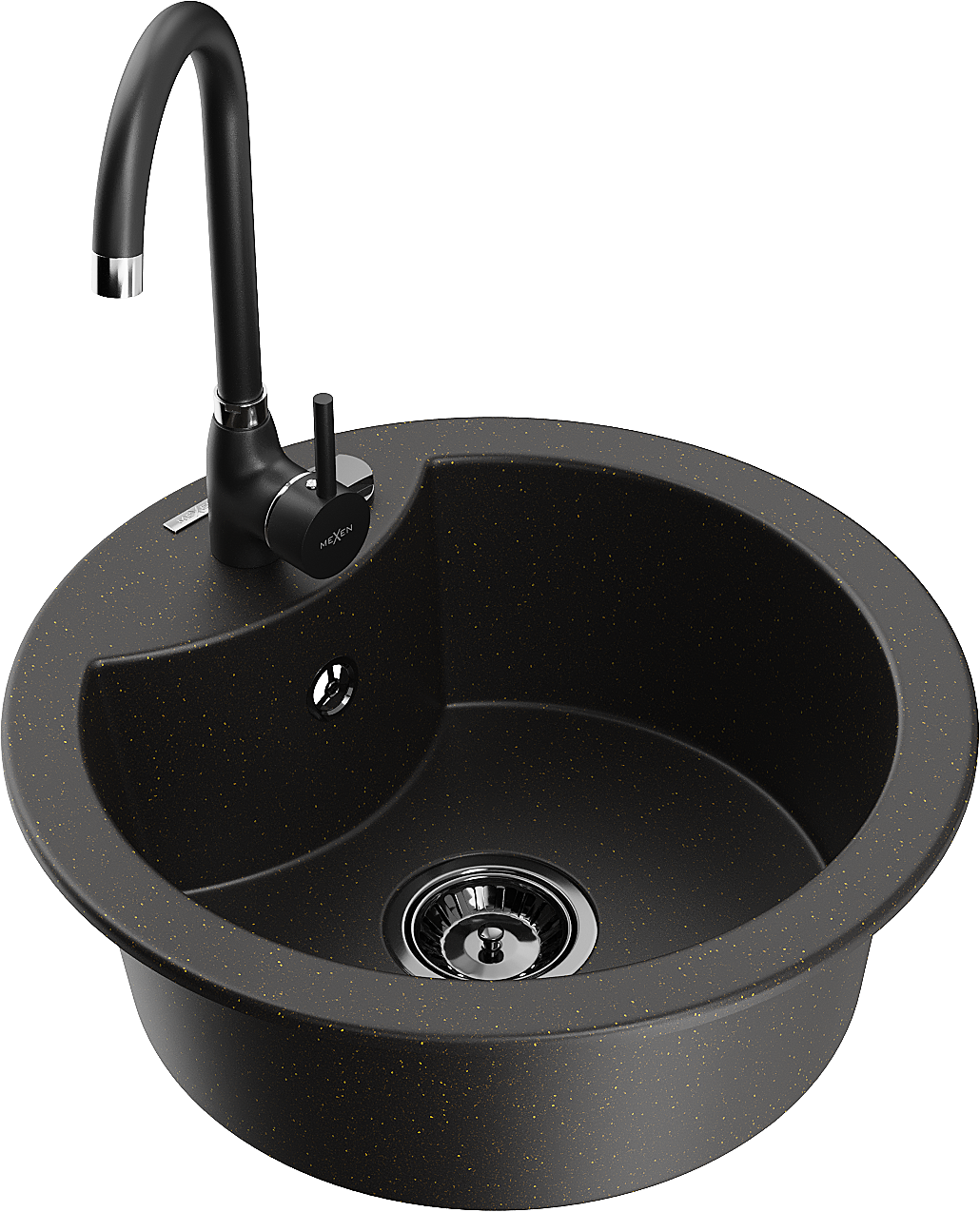 Mexen Diego évier en granit 1 bac avec robinet de cuisine Telma, noir/doré - 6512-75-670200-70-B