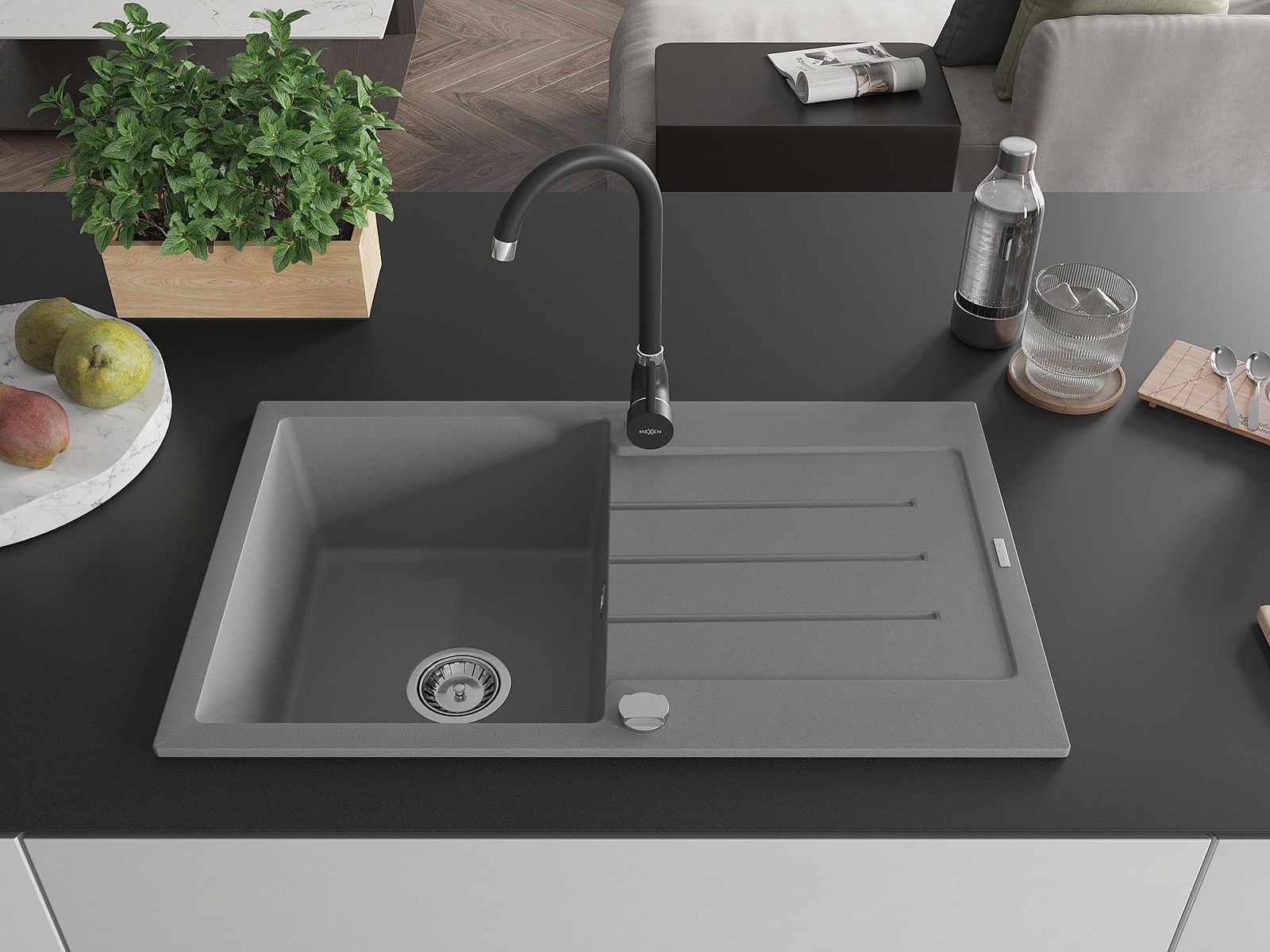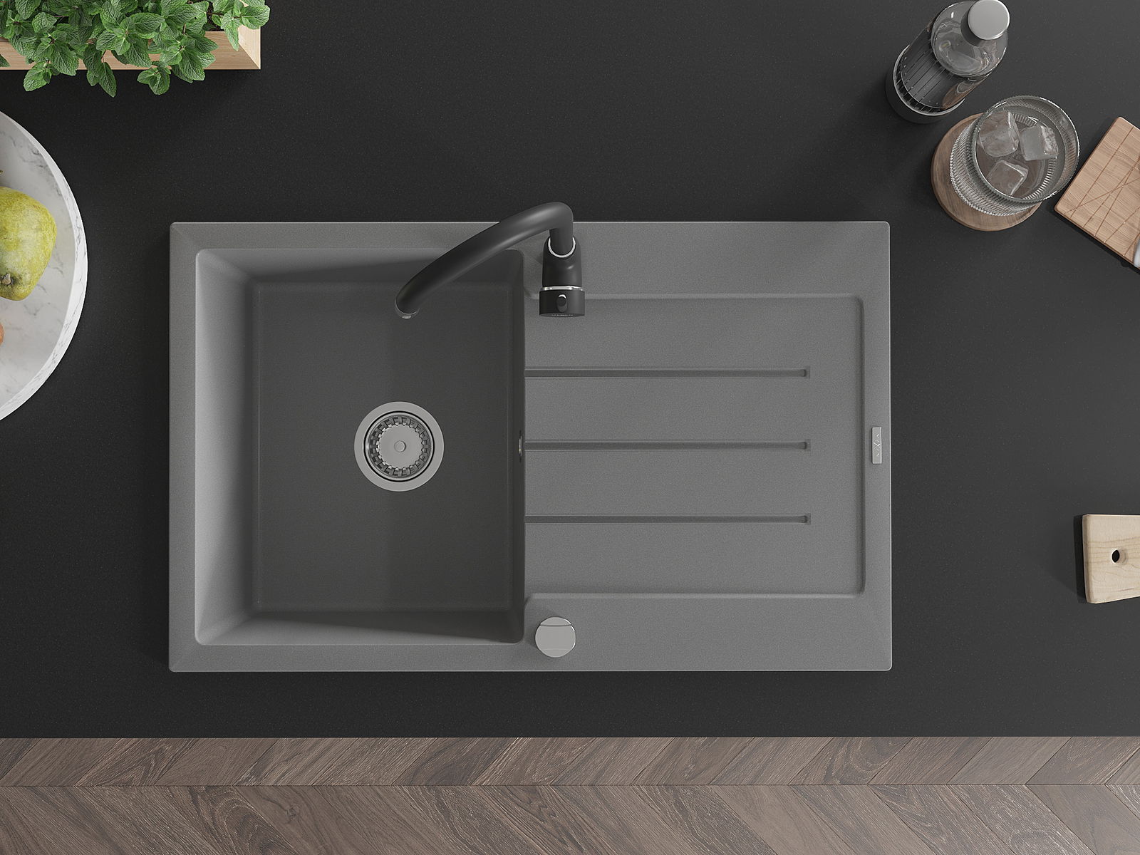 Mexen Bruno évier en granit 1 bac avec égouttoir et mitigeur de cuisine Telma, gris - 6513-71-670200-70