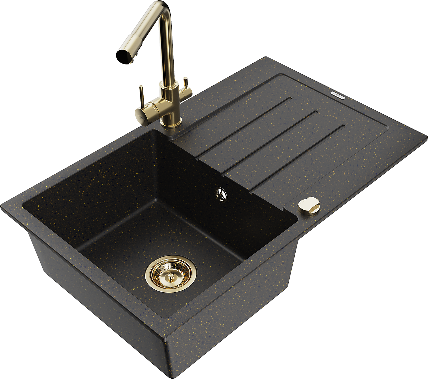 Mexen Bruno évier en granit à 1 bac avec égouttoir et robinet de cuisine Duero, noir/doré métallisé - 6513-75-671600-50
