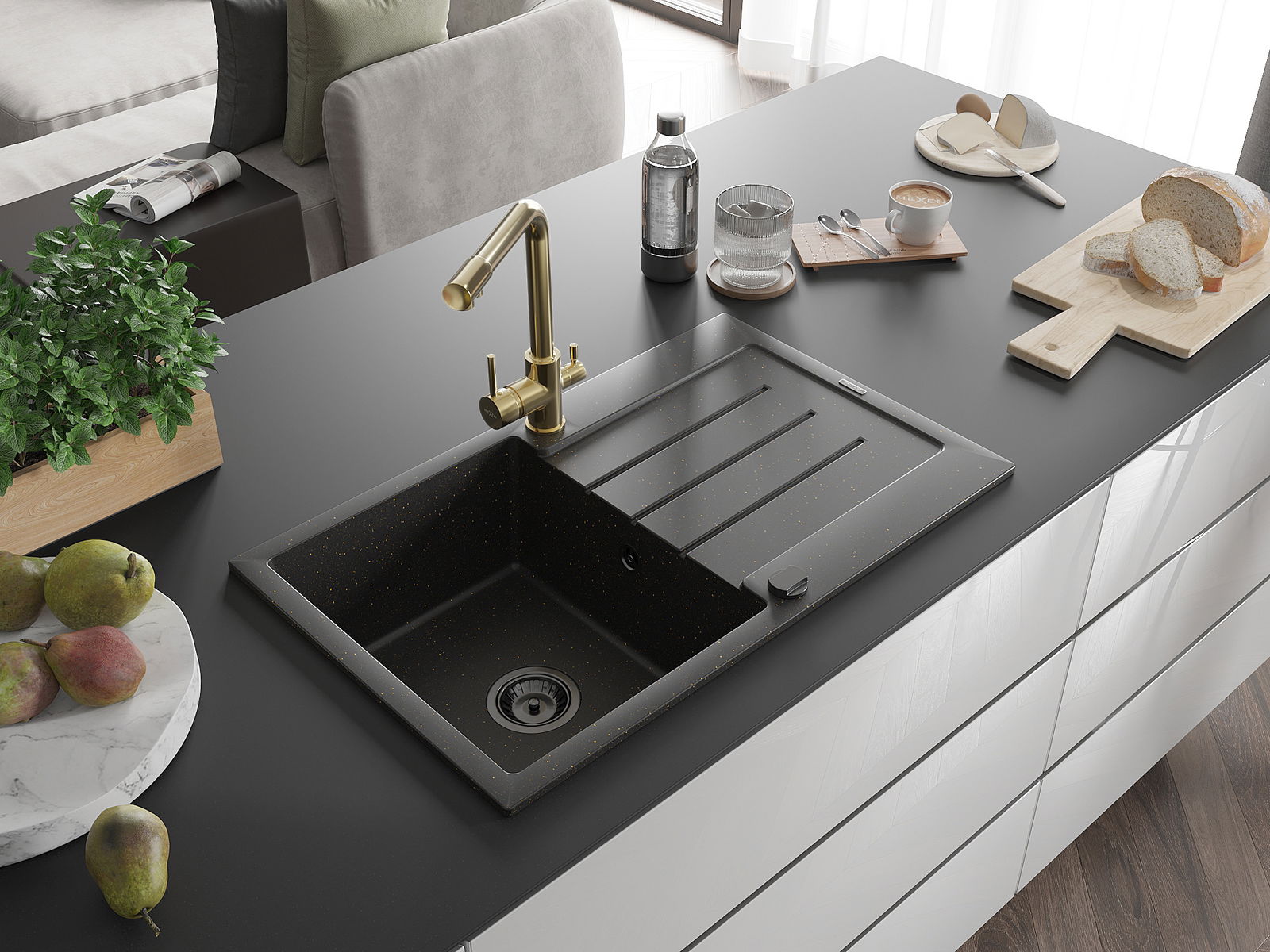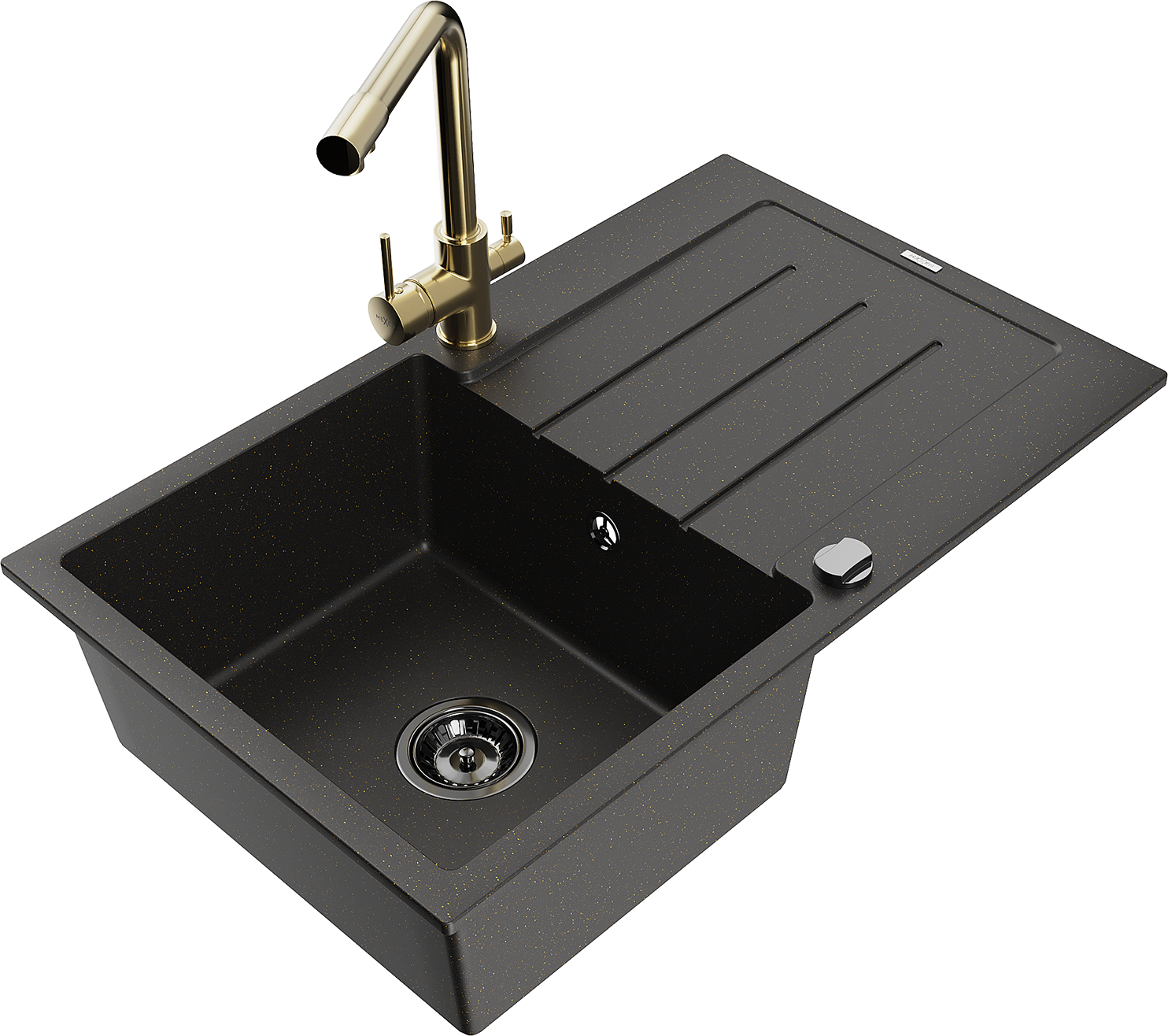 Mexen Bruno évier en granit 1 bac avec égouttoir et robinet de cuisine Duero, noir / métal doré - 6513-75-671600-50-B