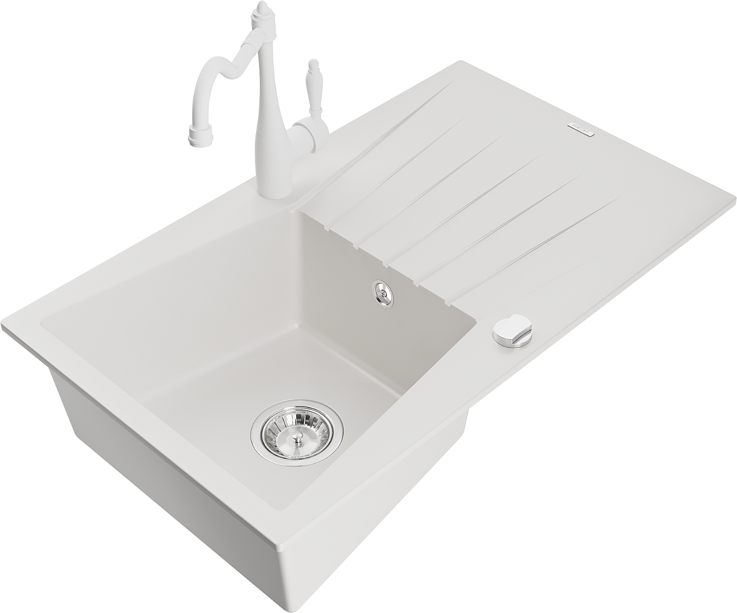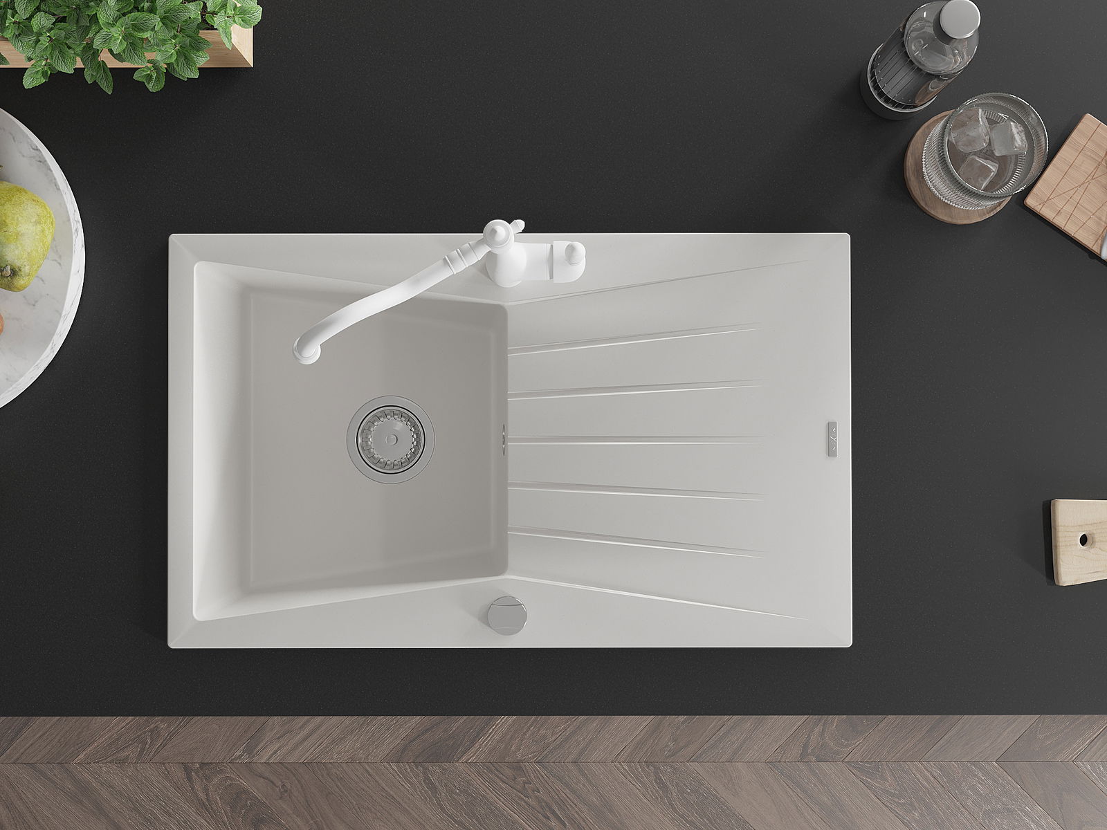 Mexen Cesar évier de cuisine en granit 1 bac avec égouttoir et robinet de cuisine Carla, blanc - 6514-20-670700-20