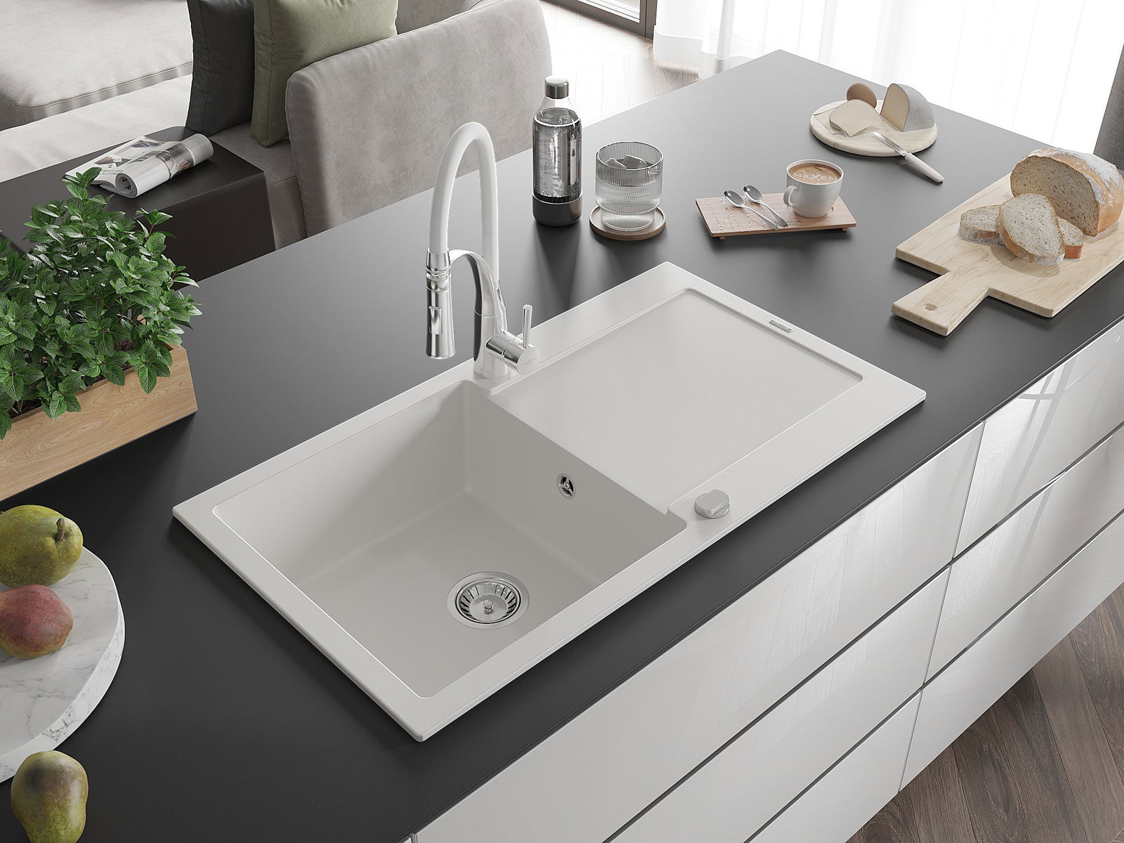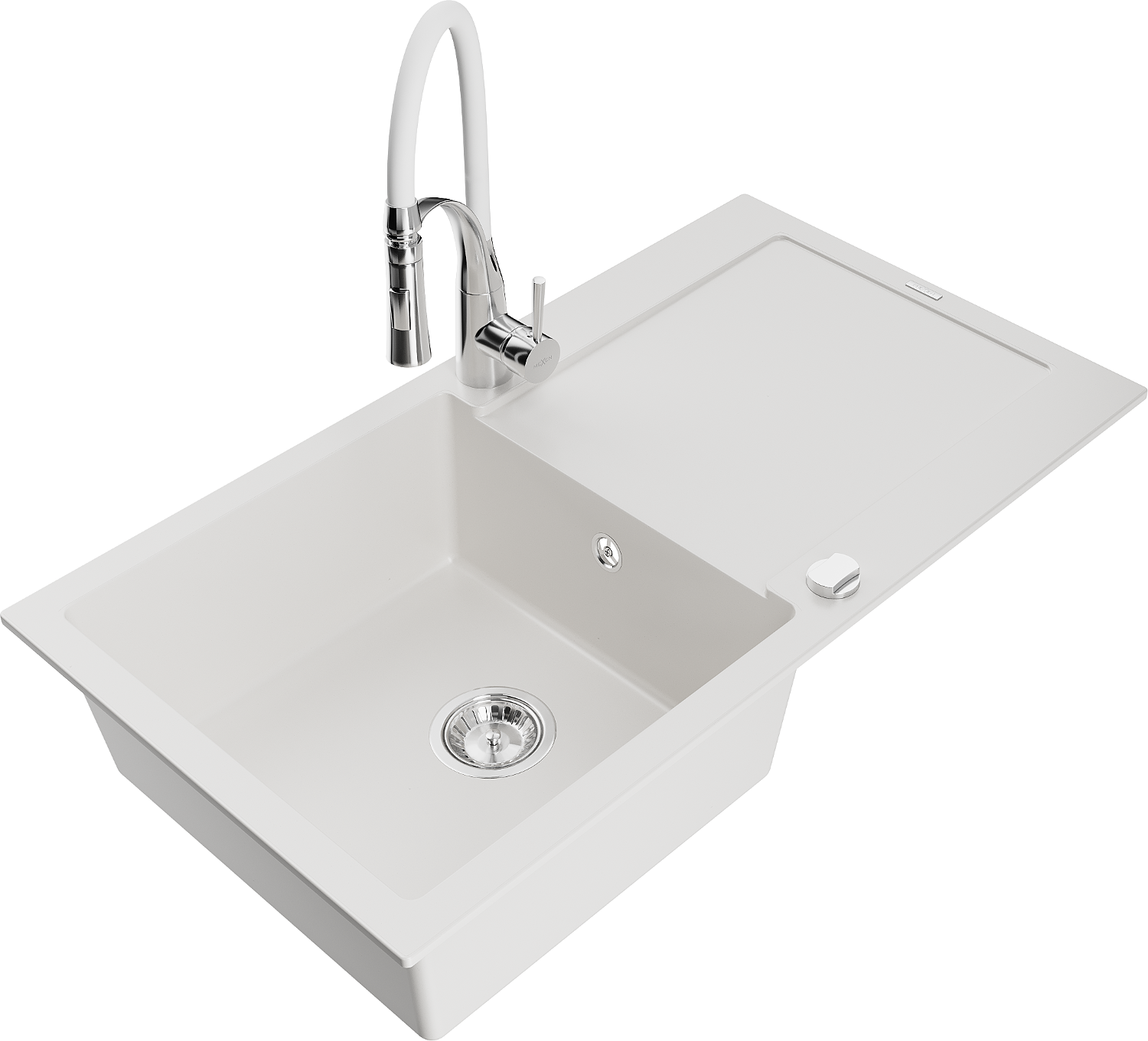 Mexen Leo évier en granit 1 bac avec égouttoir et robinet de cuisine Aster, blanc - 6501-20-73450-02