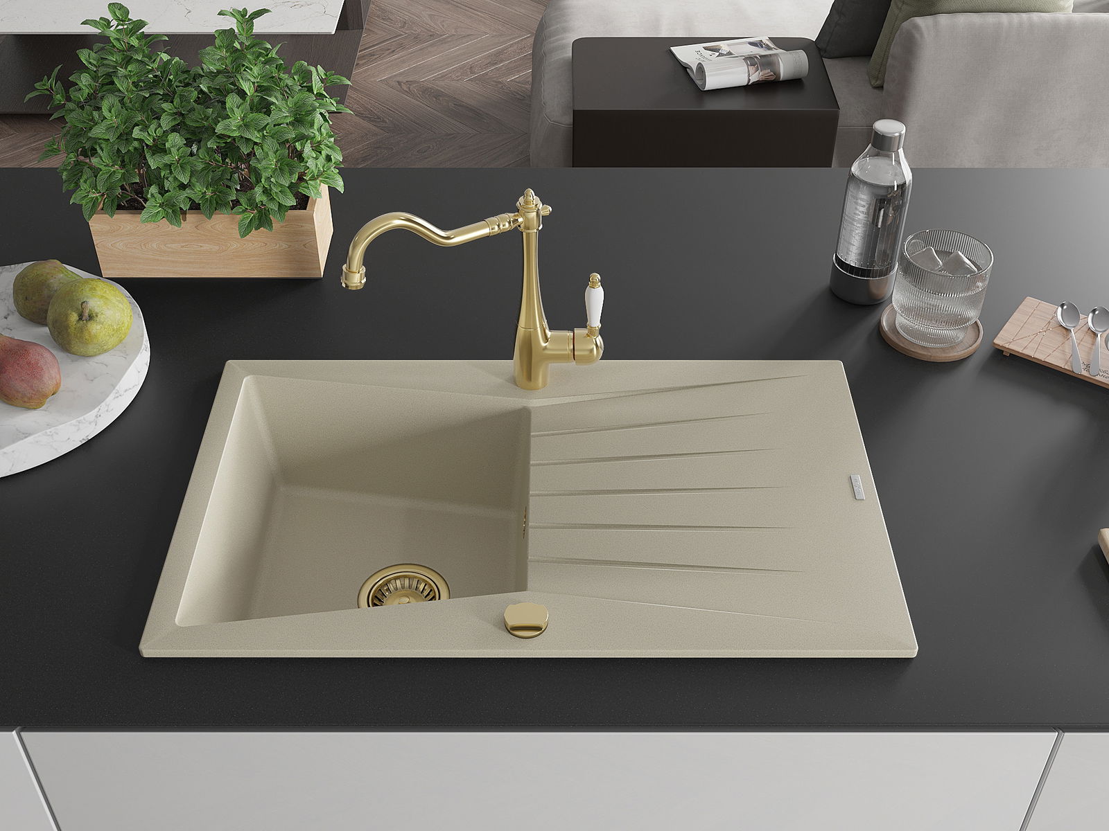 Mexen Cesar évier granit 1 bac avec égouttoir et mitigeur cuisine Carla, beige - 6514-69-670700-50