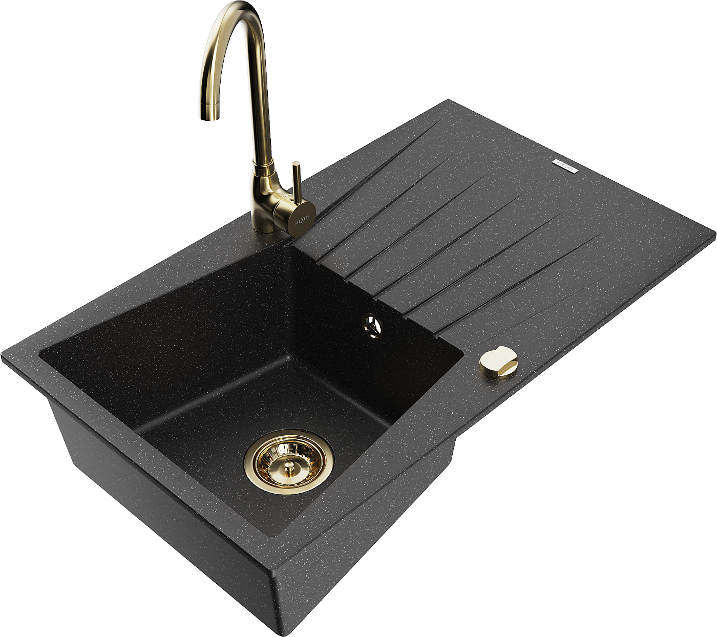 Mexen Cesar évier en granit 1 bac avec égouttoir et robinet de cuisine Telma, noir/argenté - 6514-73-670200-50