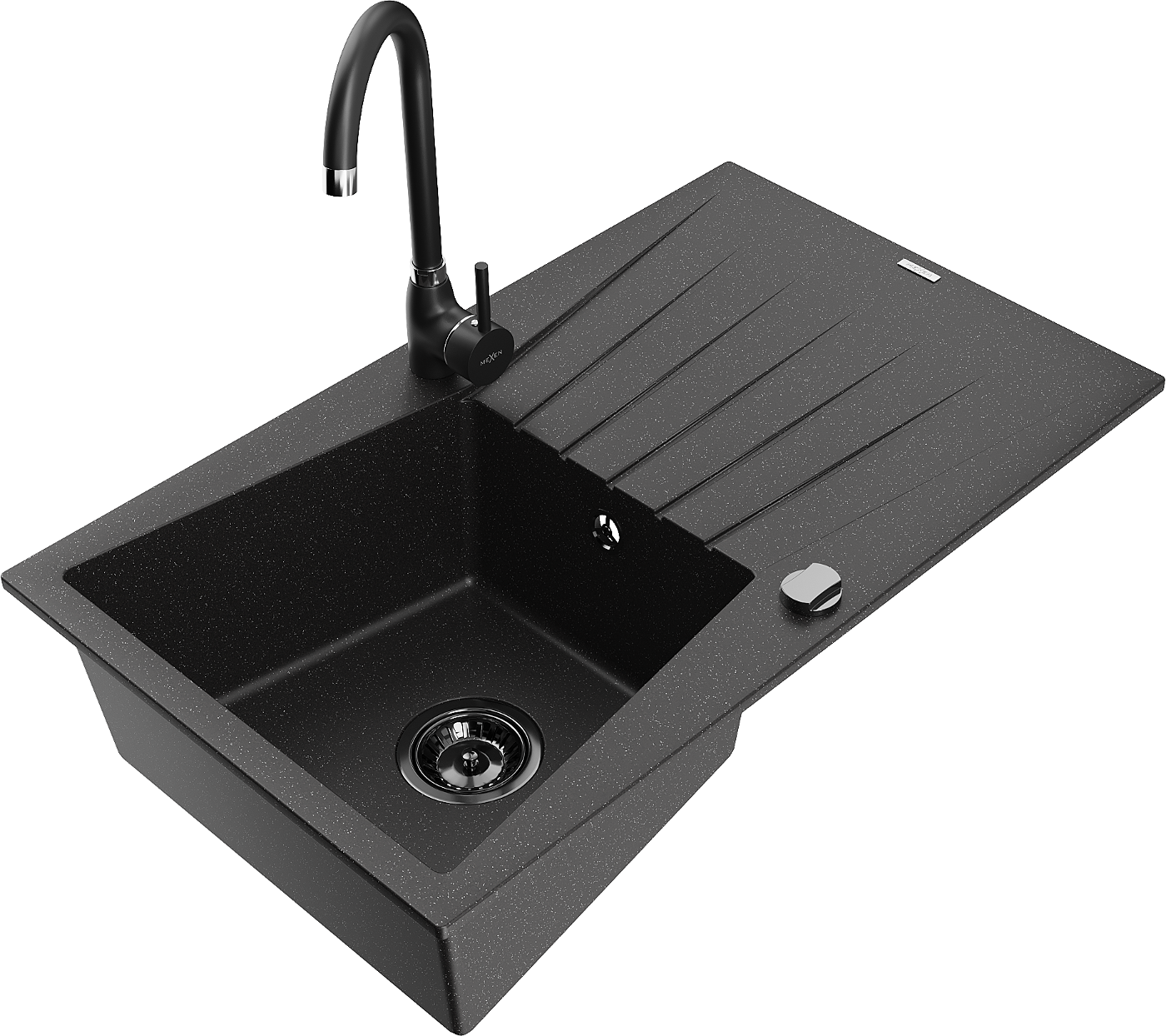 Mexen Cesar évier en granit 1 bac avec égouttoir et robinet de cuisine Telma, noir/argent - 6514-73-670200-70-B