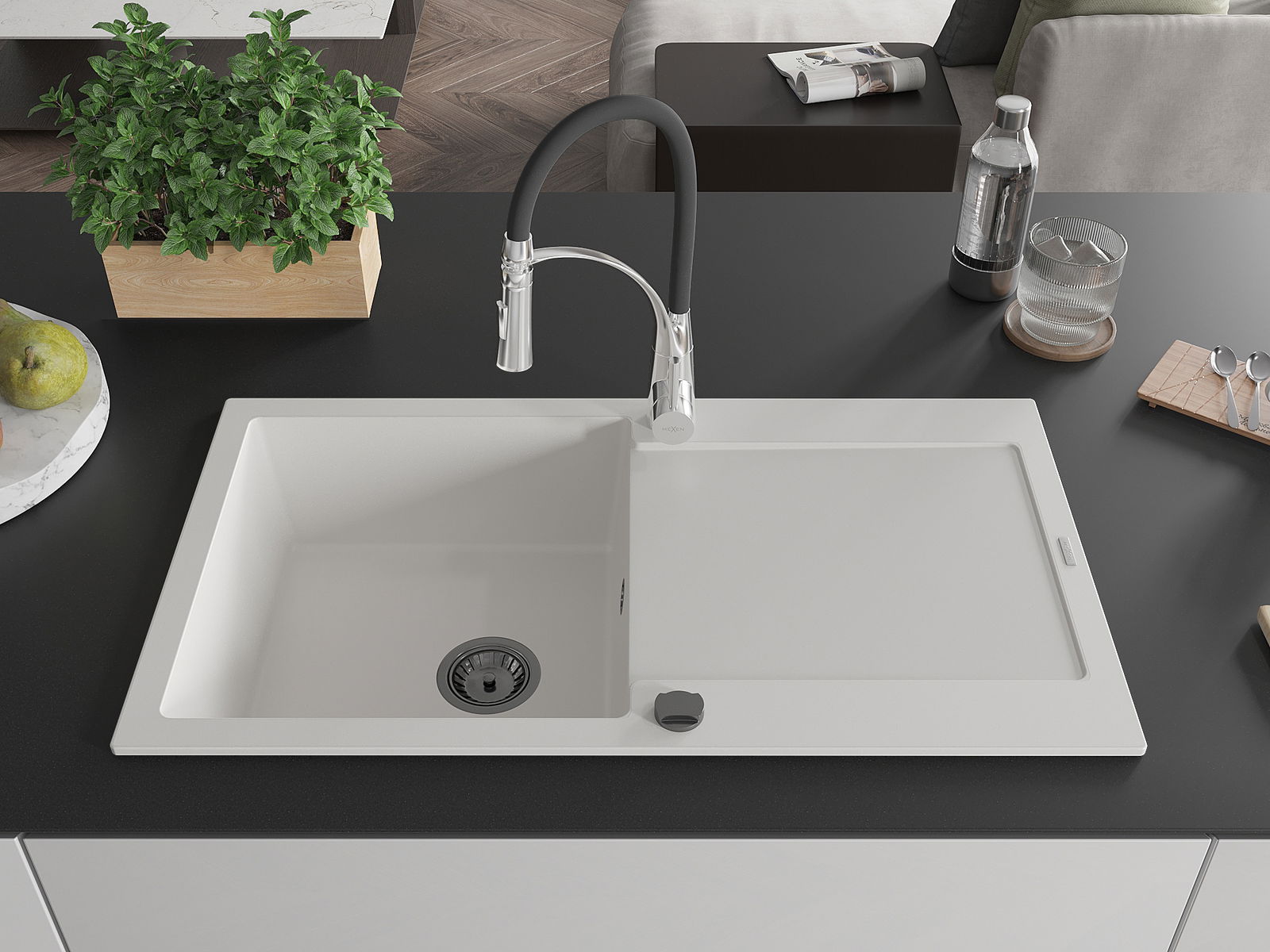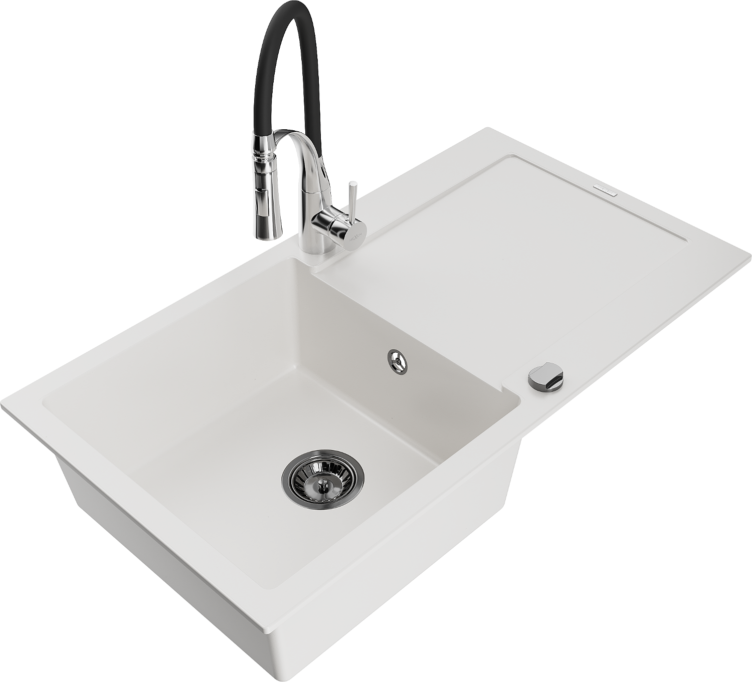 Mexen Leo évier en granit 1 bac avec égouttoir et robinet de cuisine Aster, blanc - 6501-20-73450-07-B