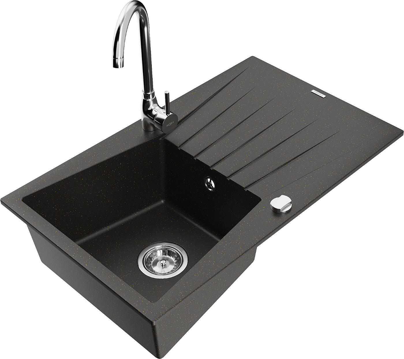 Mexen Cesar évier en granit 1 bac avec égouttoir et robinet de cuisine Telma, noir/or - 6514-75-670200-00