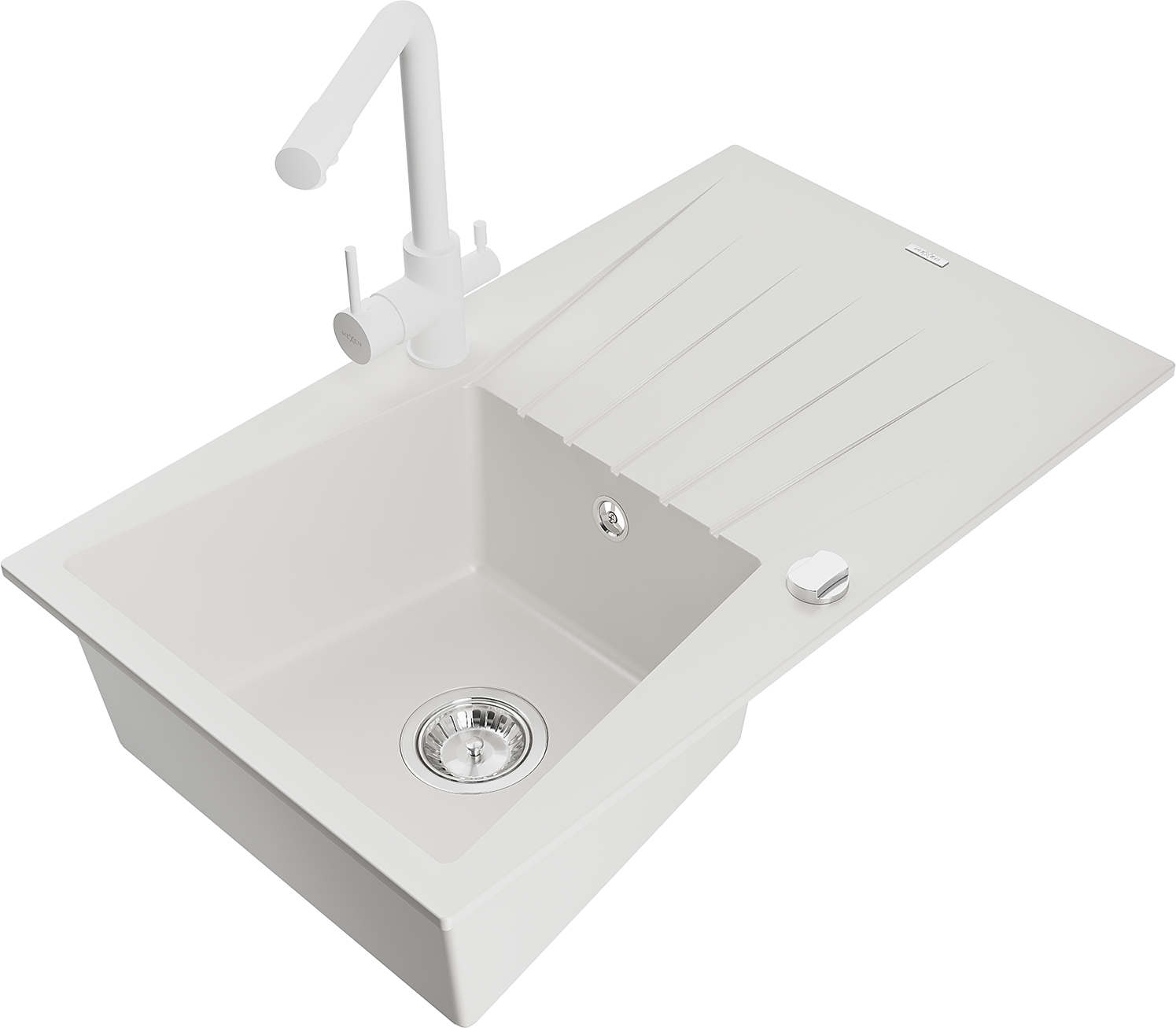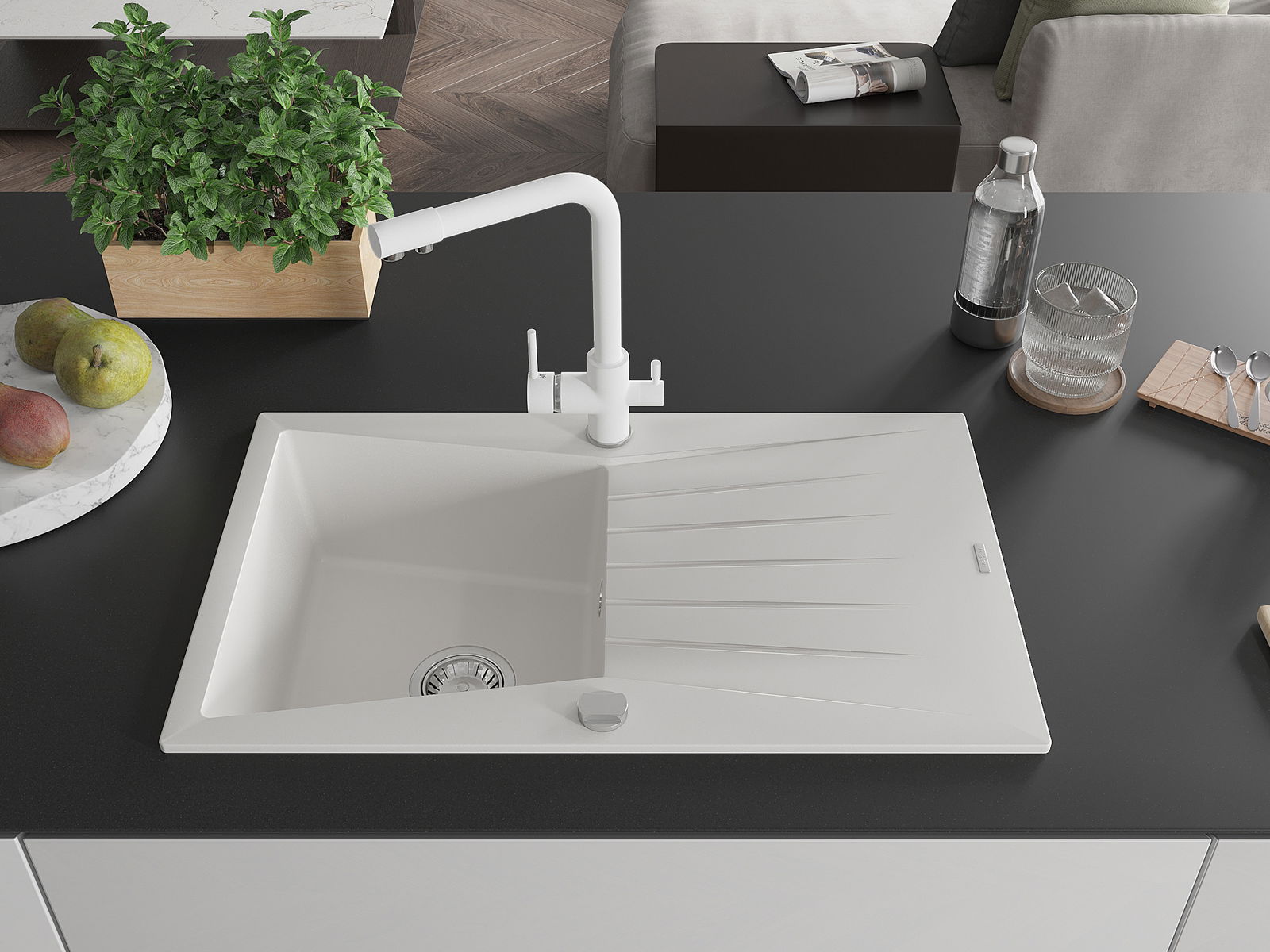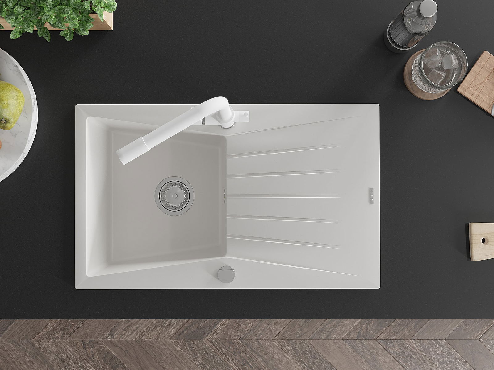 Mexen Cesar évier en granit 1 bac avec égouttoir et robinet de cuisine Duero, blanc - 6514-20-671600-20