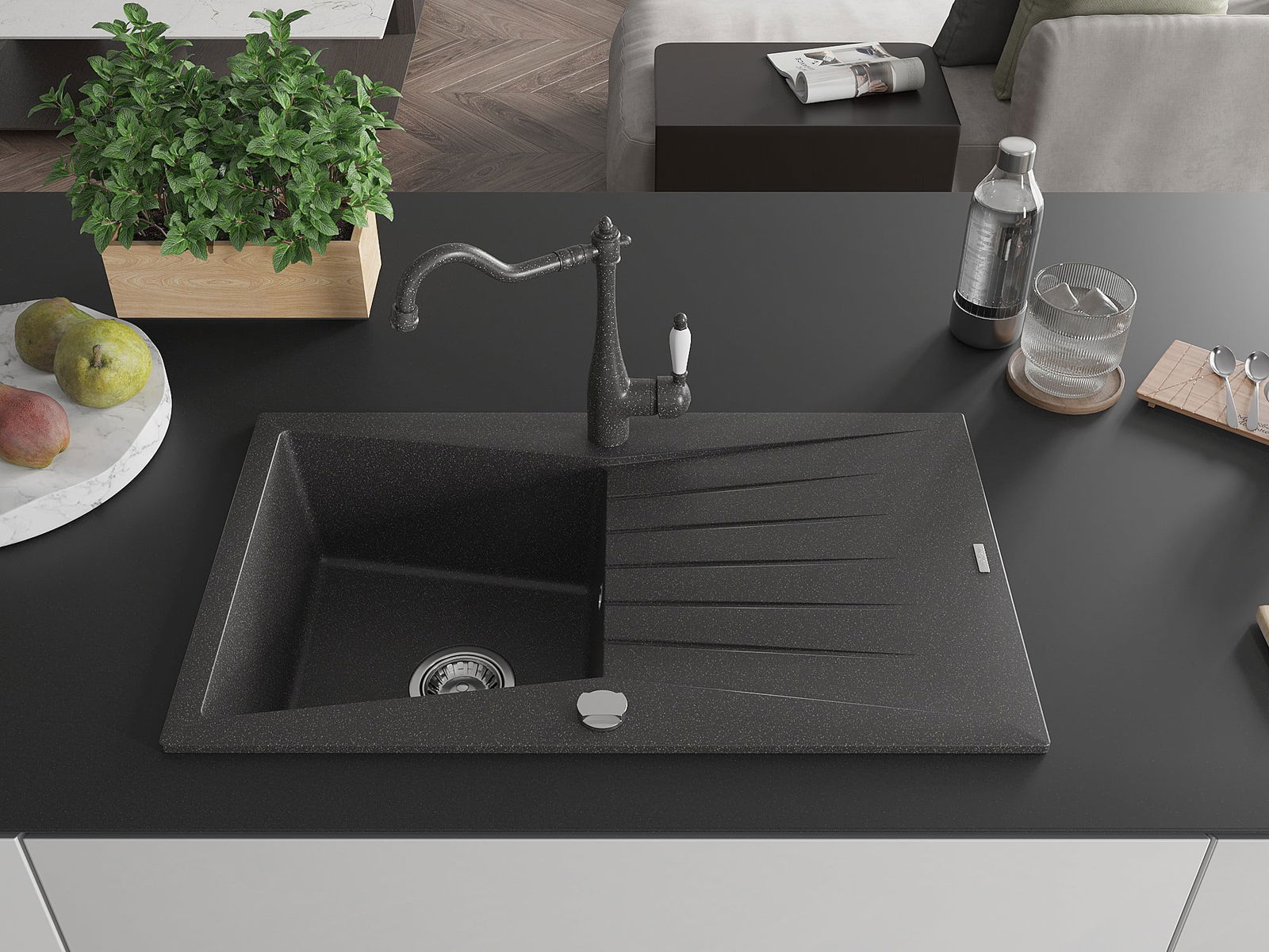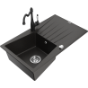 Mexen Cesar évier de cuisine en granit à 1 bac avec égouttoir et mitigeur Carla, noir moucheté - 6514-76-670700-76