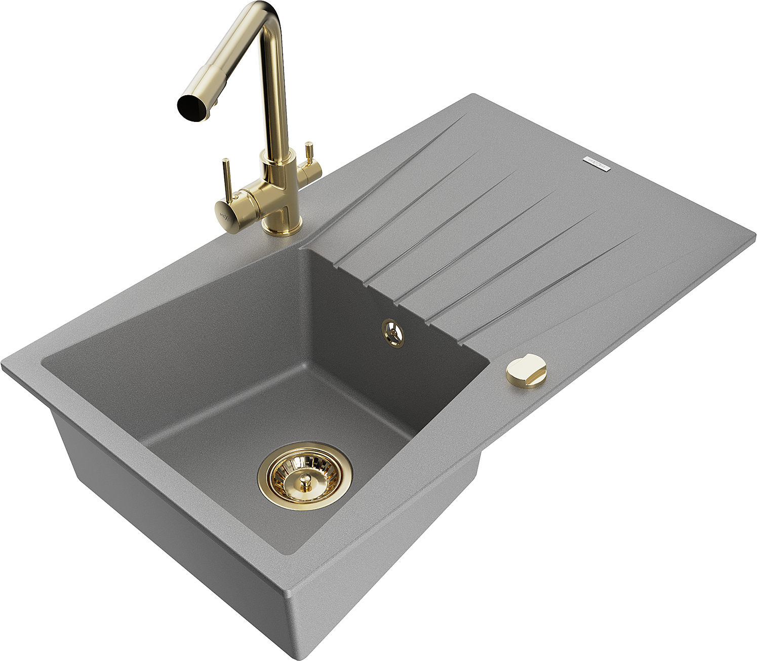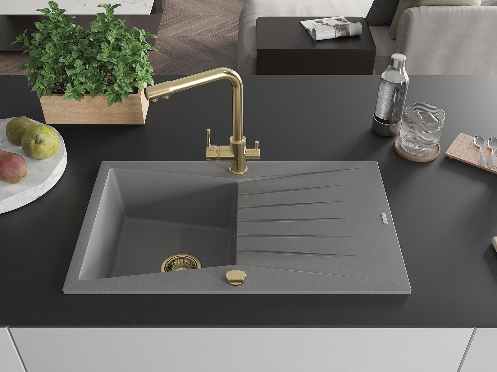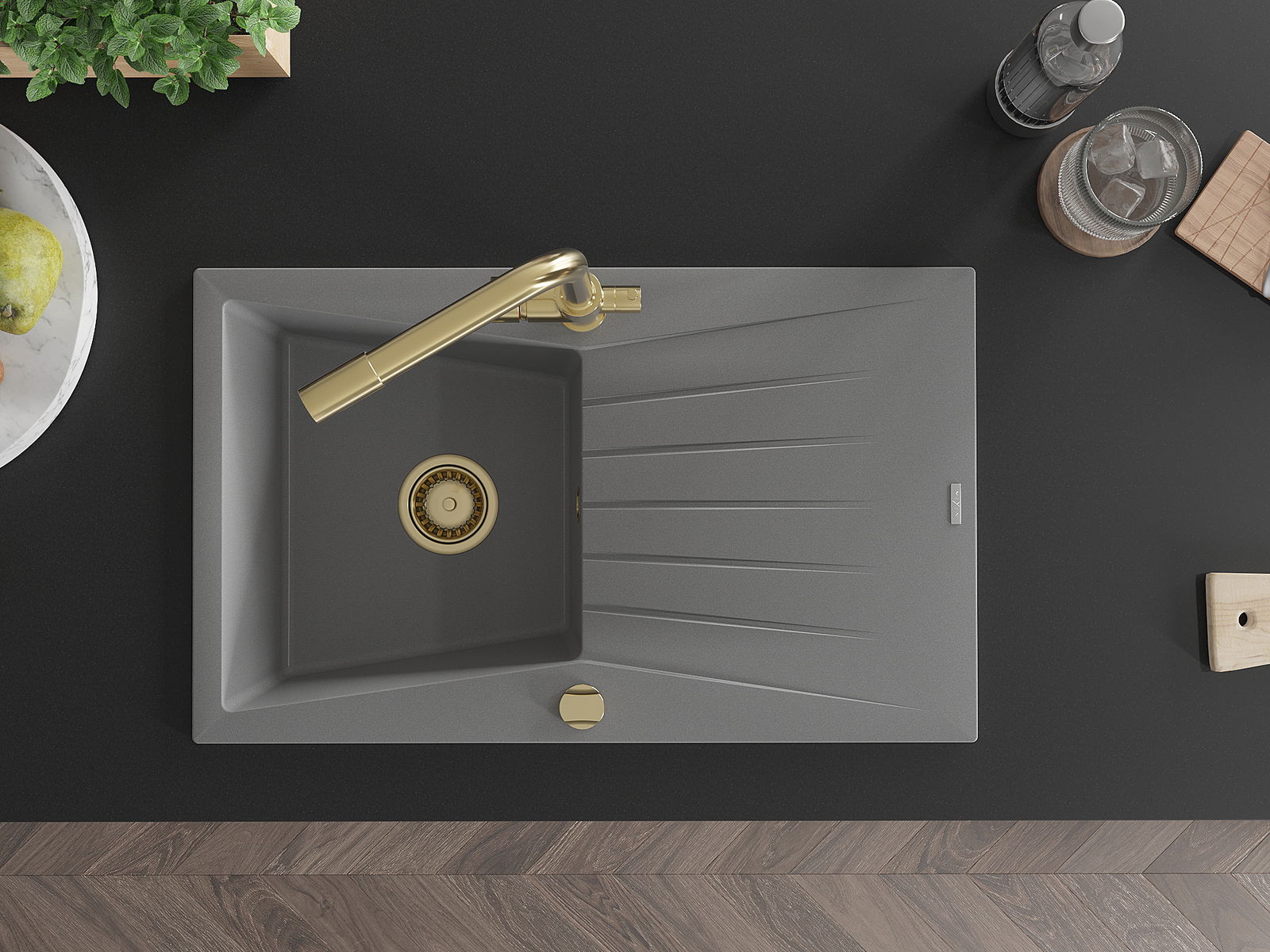 Mexen Cesar évier en granit à 1 bac avec égouttoir et robinet de cuisine Duero, gris - 6514-71-671600-50