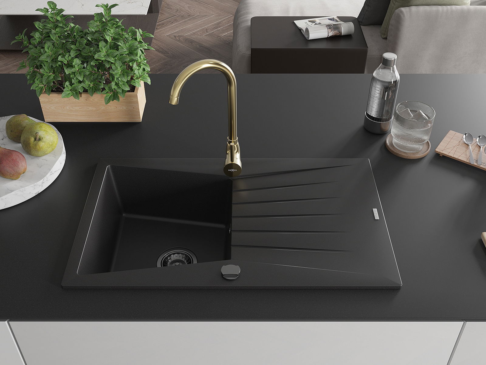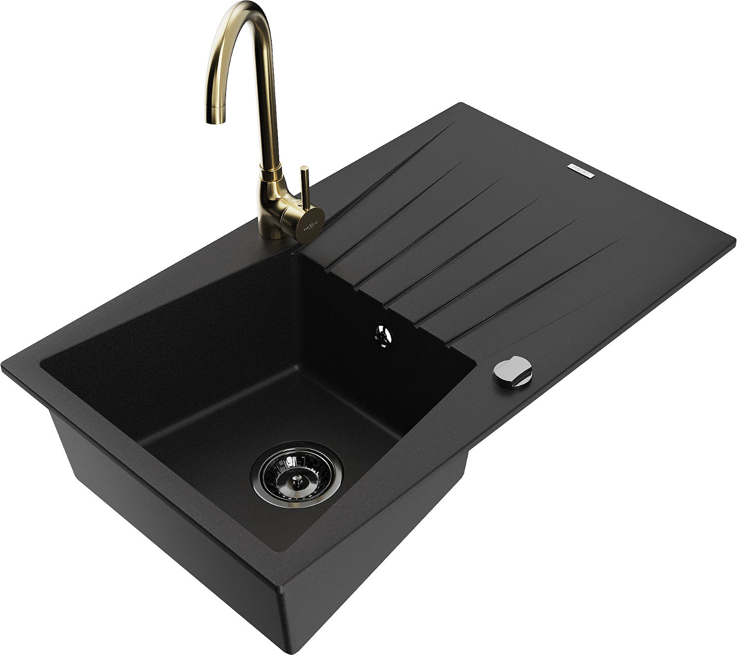Mexen Cesar évier en granit 1 bac avec égouttoir et robinet de cuisine Telma, noir - 6514-77-670200-50-B