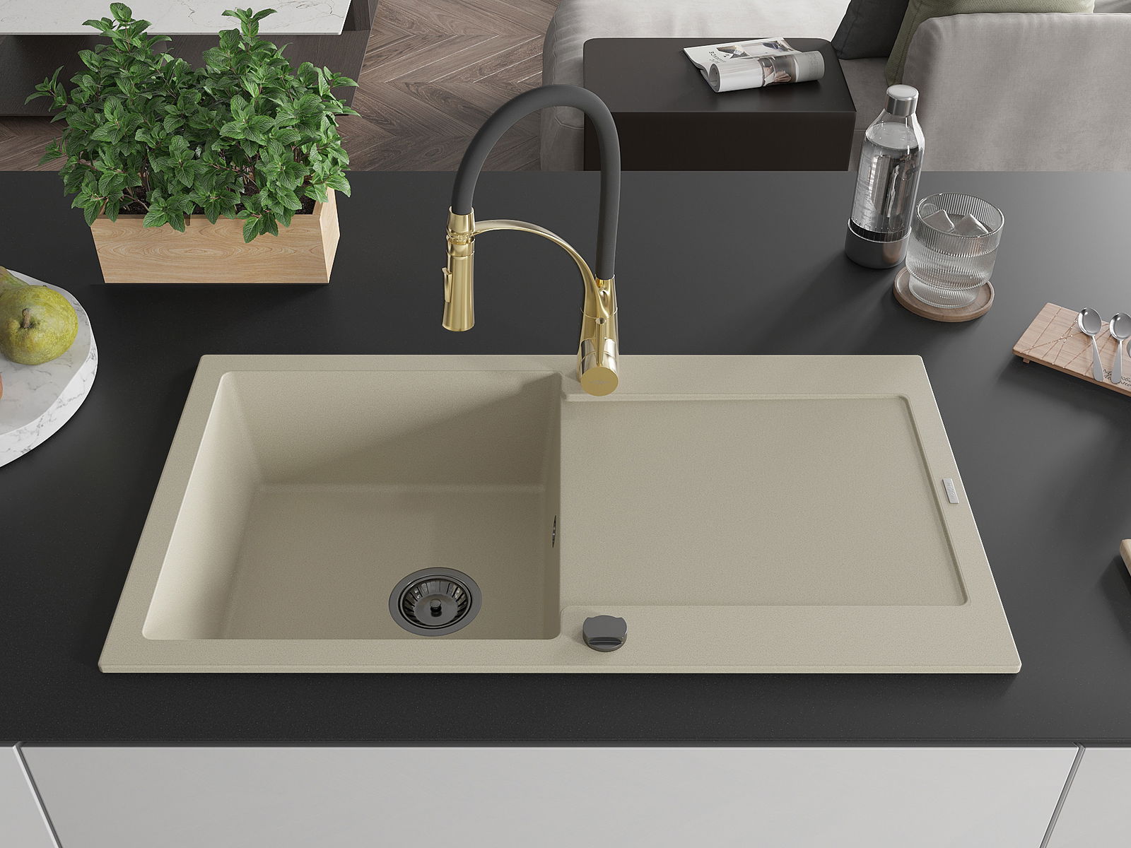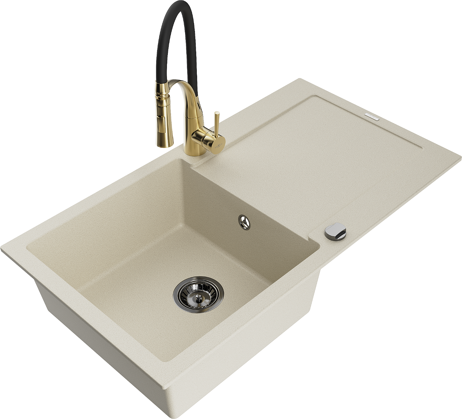 Mexen Leo évier en granit 1 bac avec égouttoir et robinet de cuisine Aster, beige - 6501-69-73450-57-B