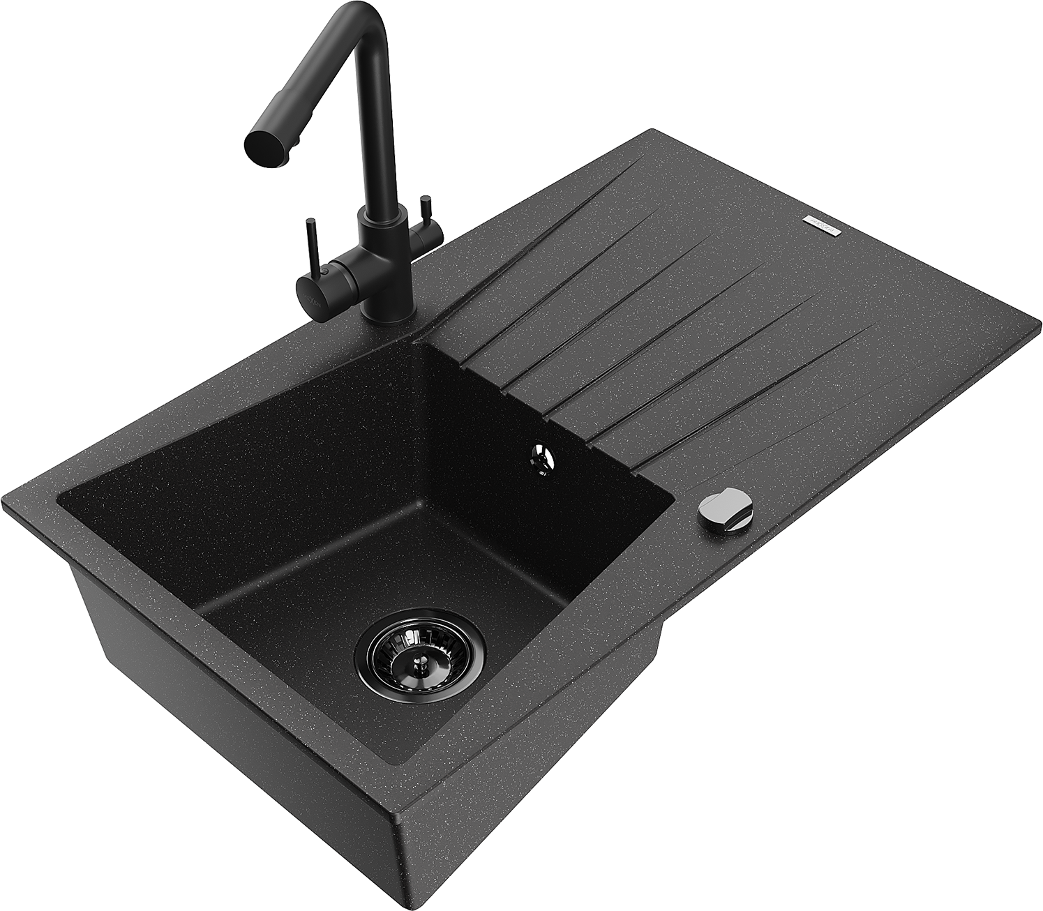 Mexen Cesar évier de cuisine en granit 1 bac avec égouttoir et robinet Duero, noir/métallique argent - 6514-73-671600-70-B