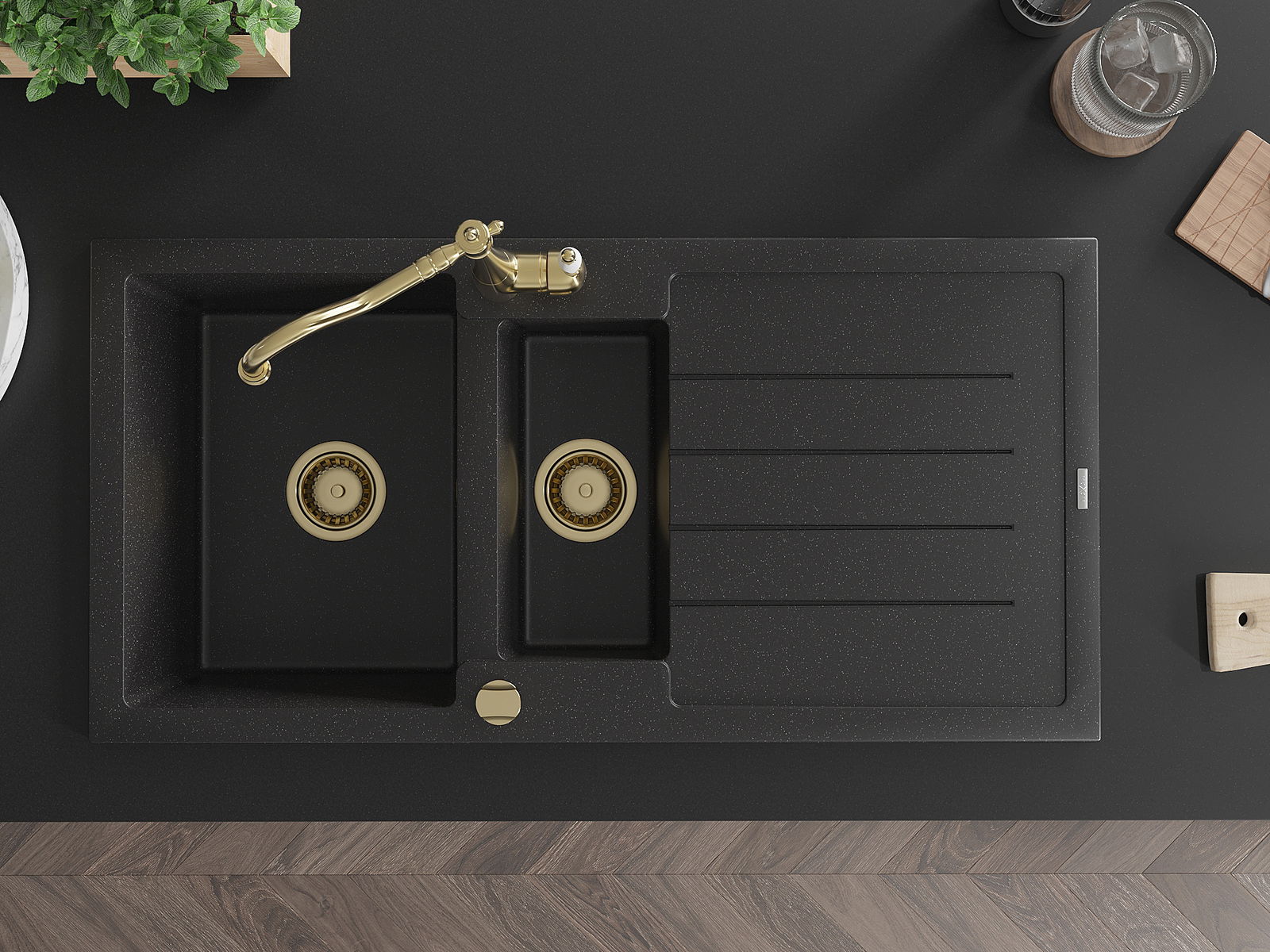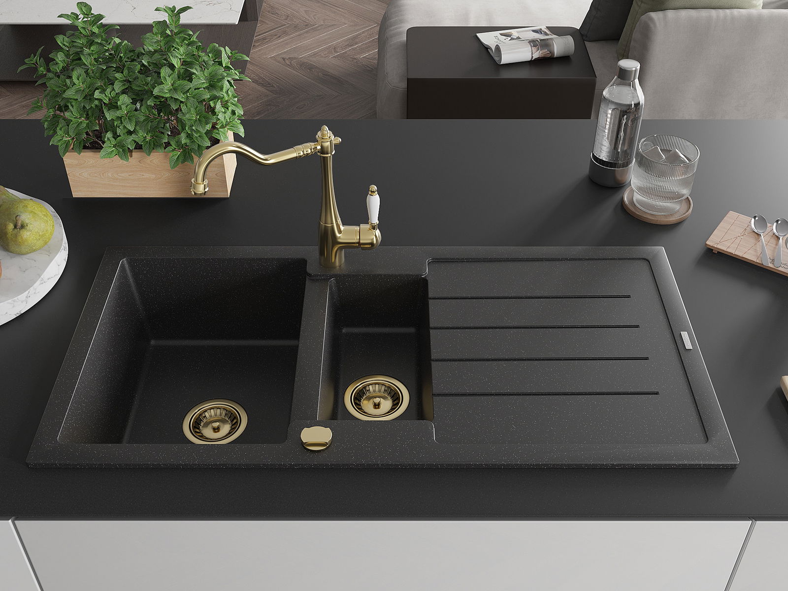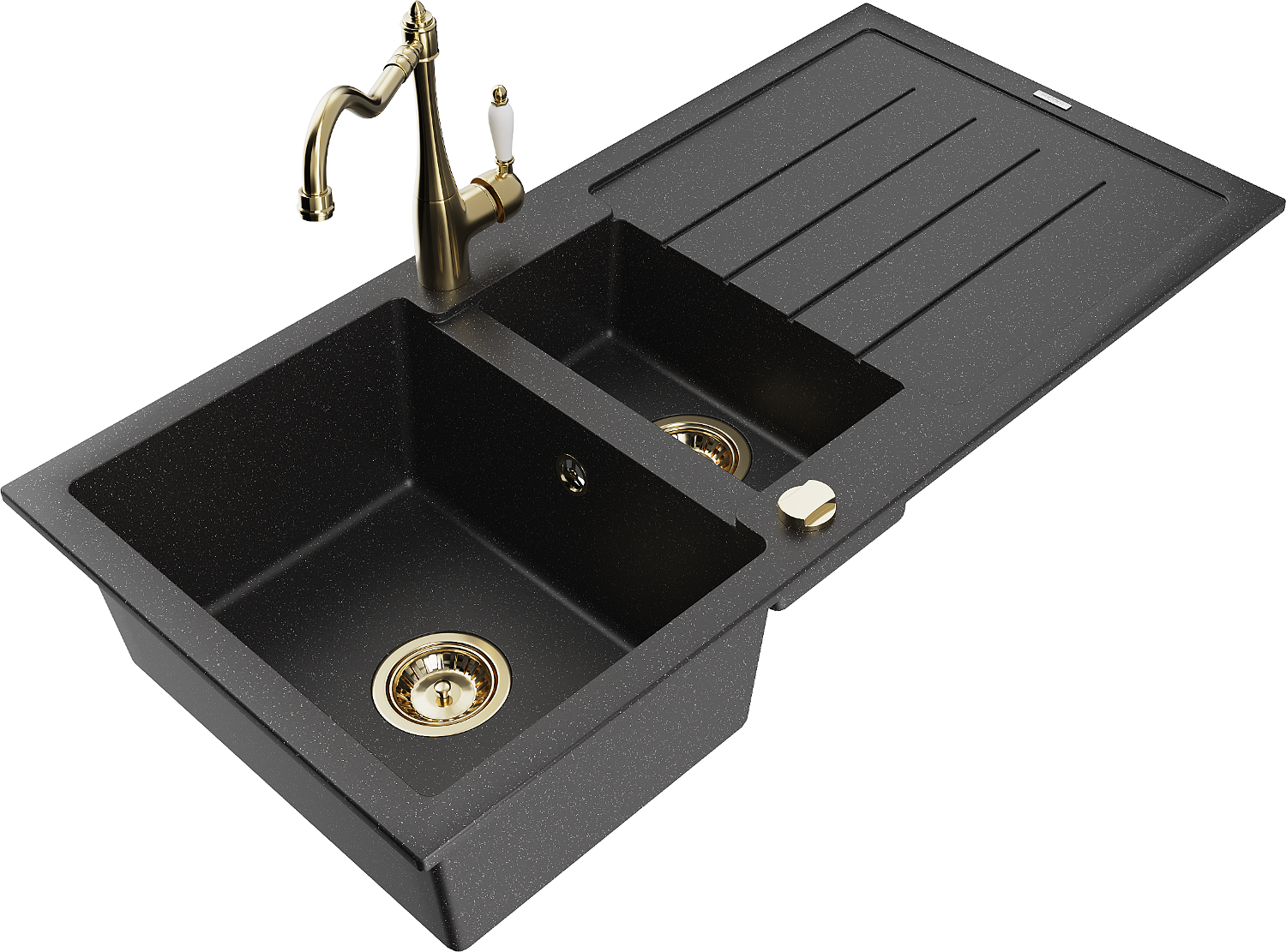 Mexen Andres évier en granit 1,5 bac avec égouttoir et robinet de cuisine Carla, noir/argent - 6515-73-670700-50
