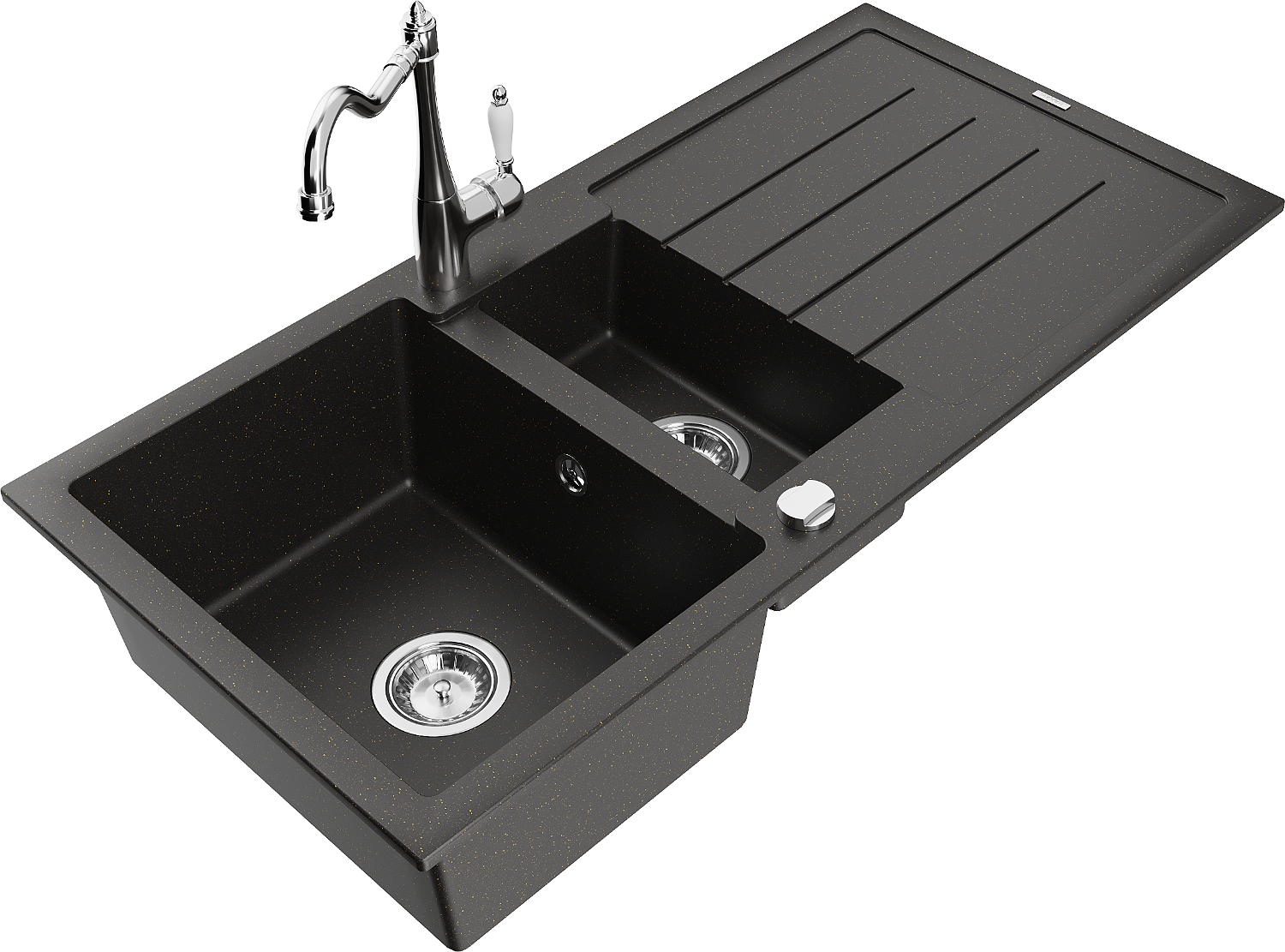 Mexen Andres évier en granit 1,5 bac avec égouttoir et robinet de cuisine Carla, noir/or métallisé - 6515-75-670700-00