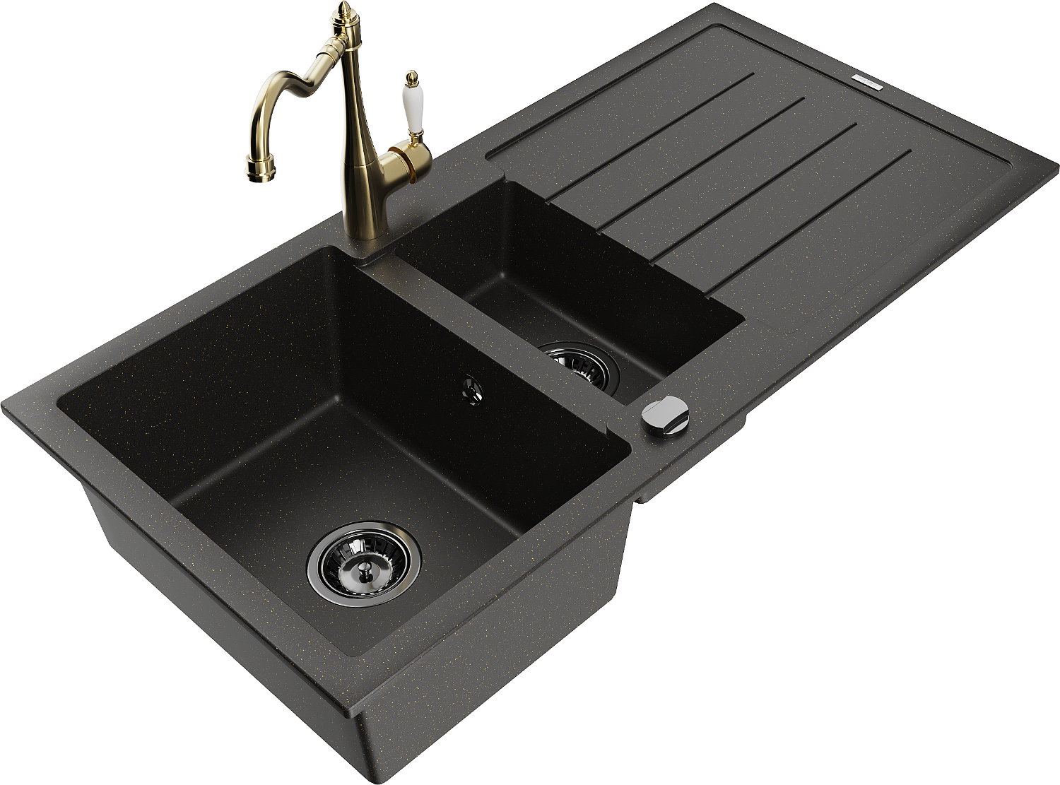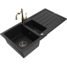 Mexen Andres évier en granit 1,5 bac avec égouttoir et robinet de cuisine Carla, noir/or - 6515-75-670700-50-B