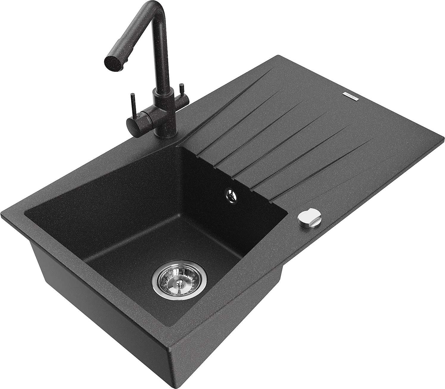 Mexen Cesar évier en granit 1 bac avec égouttoir et robinet de cuisine Duero, noir moucheté - 6514-76-671600-76