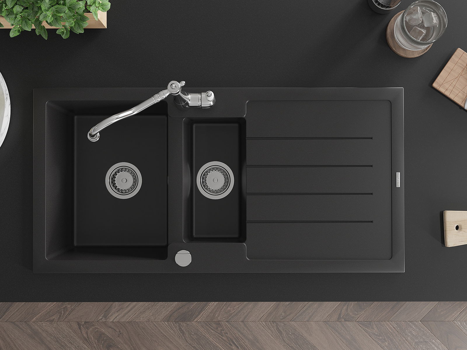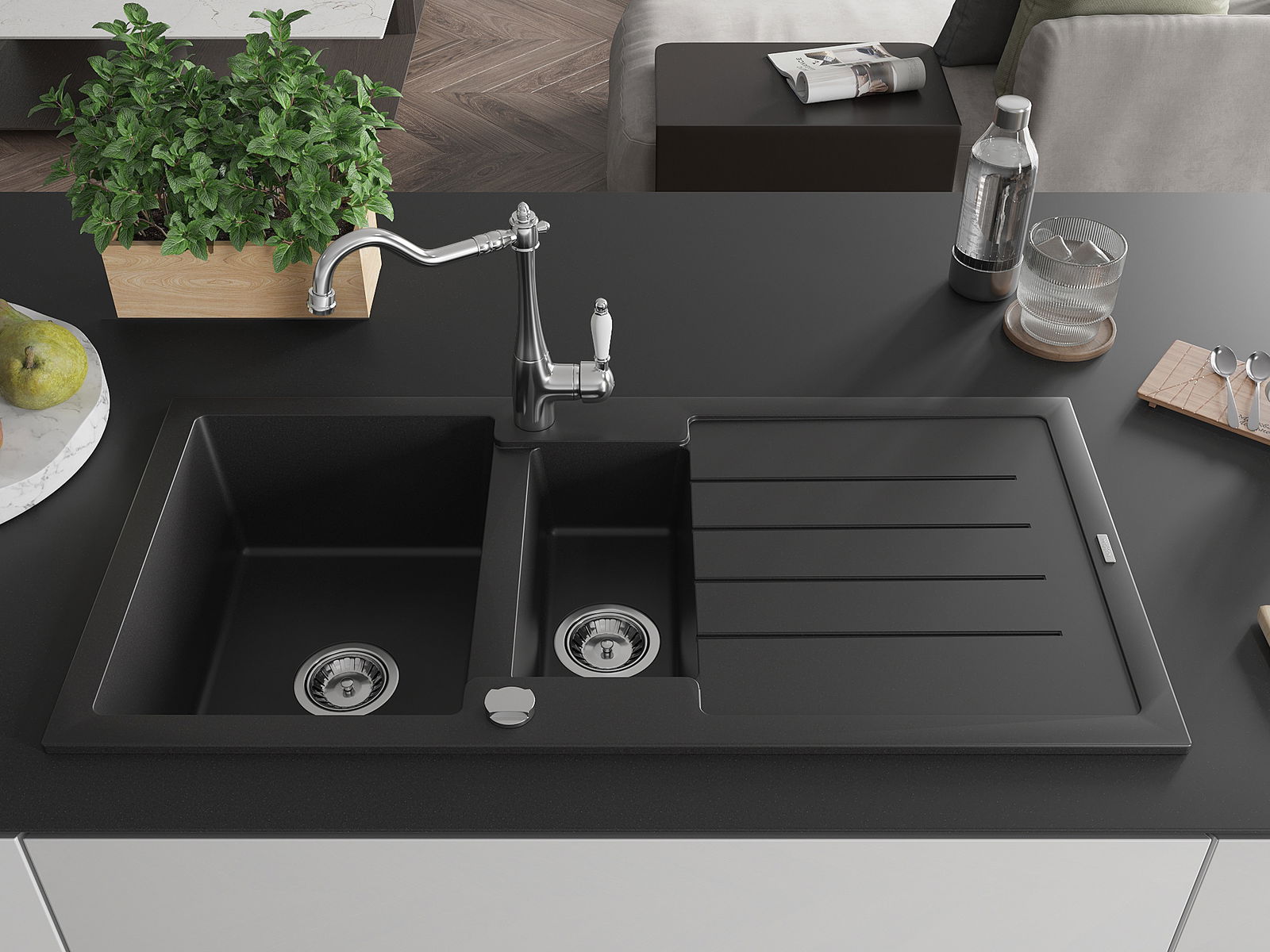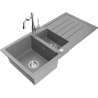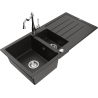Mexen Andres évier en granit 1,5 bac avec égouttoir et robinet de cuisine Carla, noir - 6515-77-670700-00