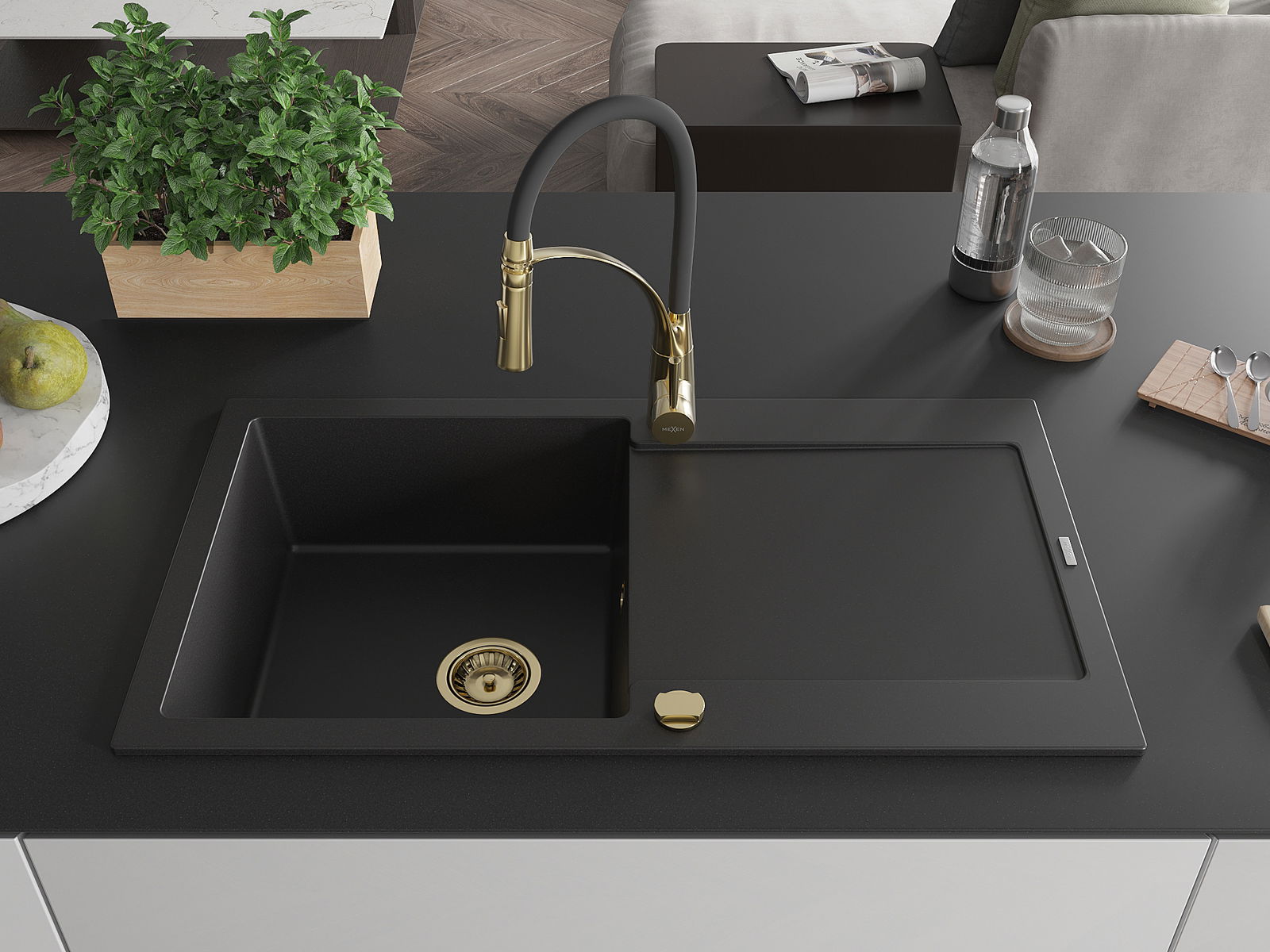Mexen Leo évier en granit 1 bac avec égouttoir et mitigeur de cuisine Aster, noir - 6501-77-73450-57-G