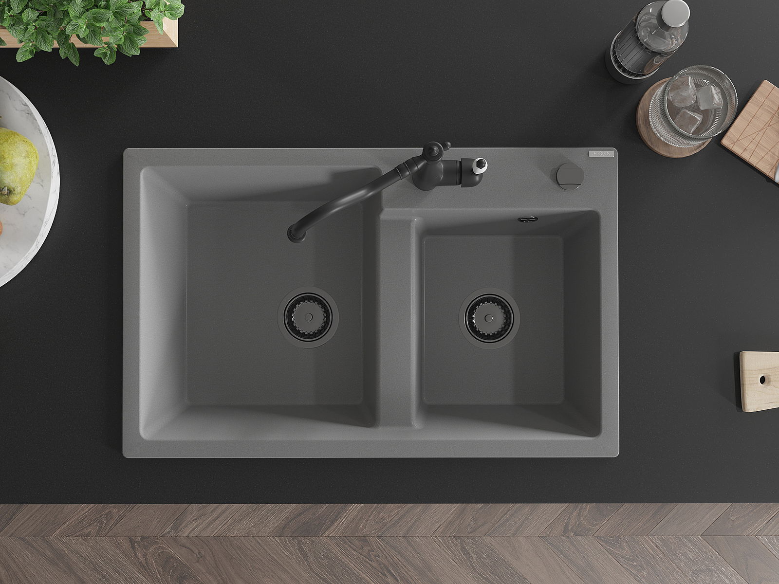 Mexen Tomas évier granit 2 bacs avec robinet de cuisine Carla, gris - 6516-71-670700-70-B