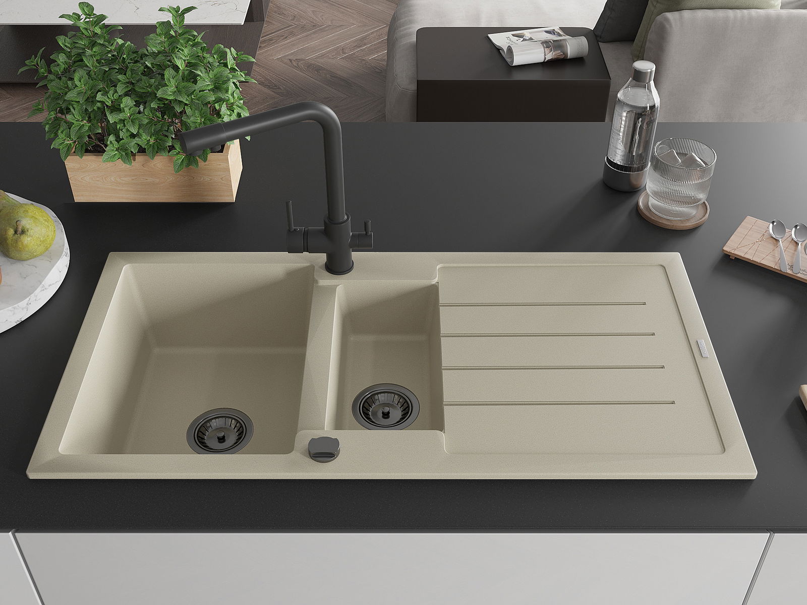 Mexen Andres évier en granit 1,5 bac avec égouttoir et robinet de cuisine Duero, beige - 6515-69-671600-70