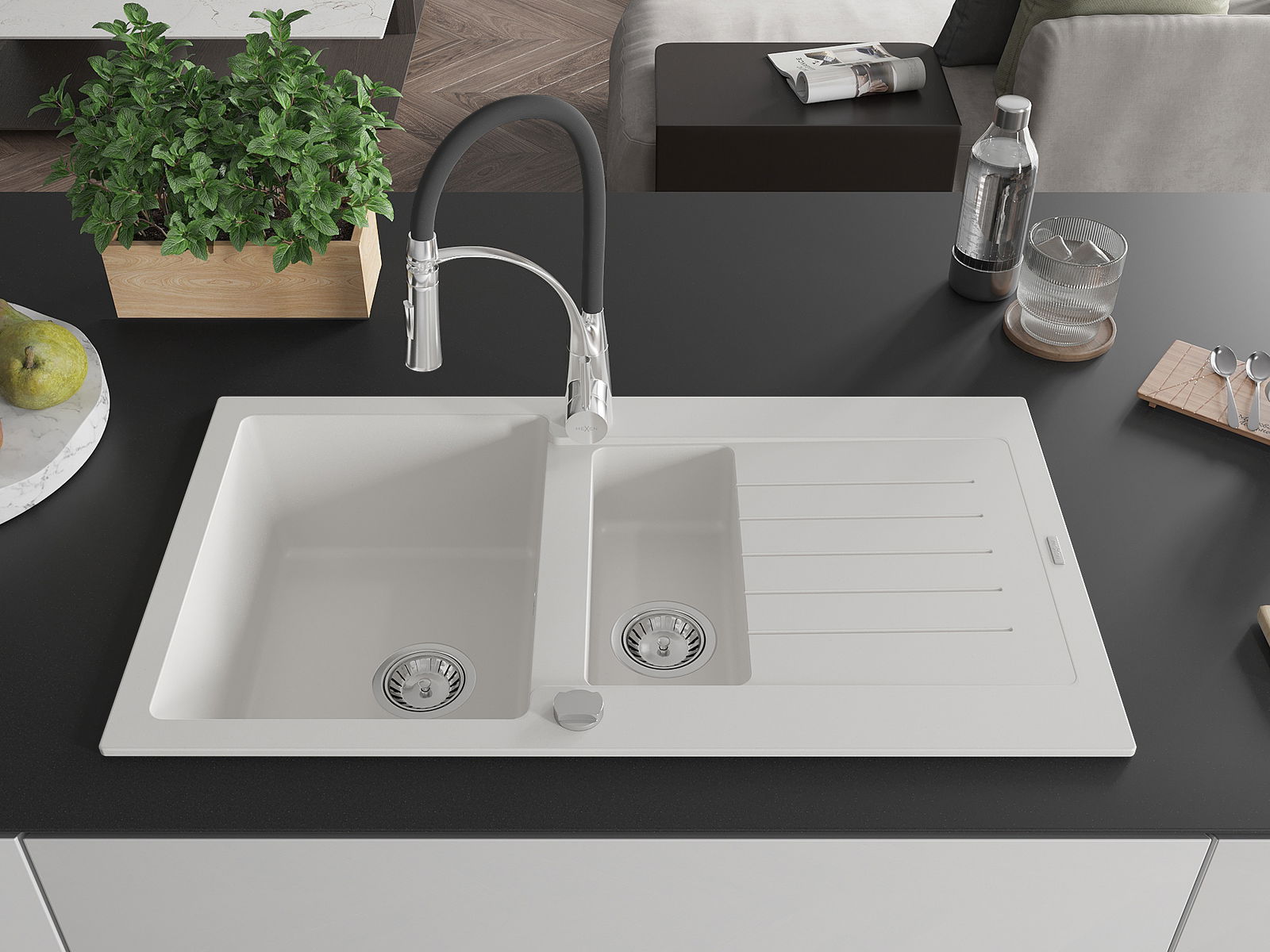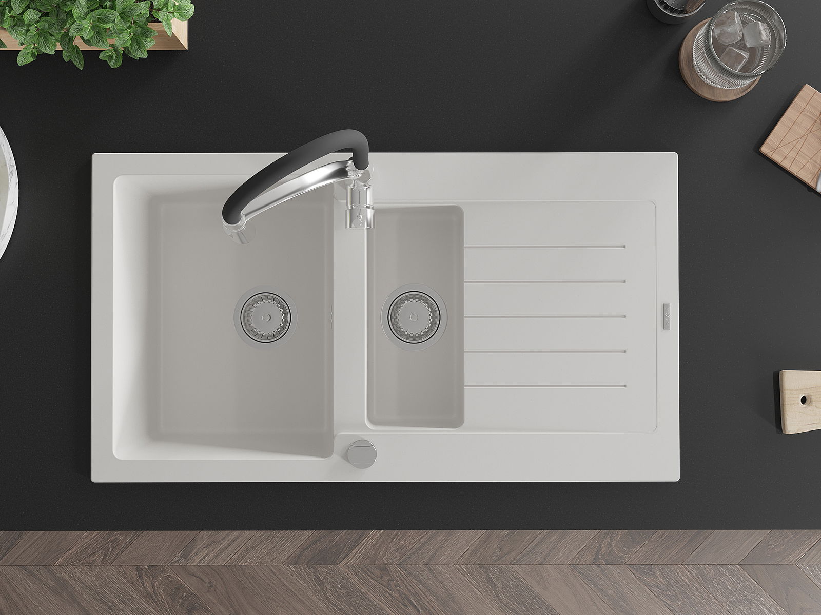 Mexen Matias évier en granit 1,5 bac avec égouttoir et robinet de cuisine Aster, blanc - 6502-20-73450-07