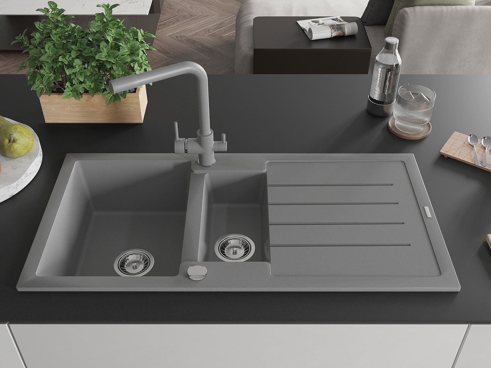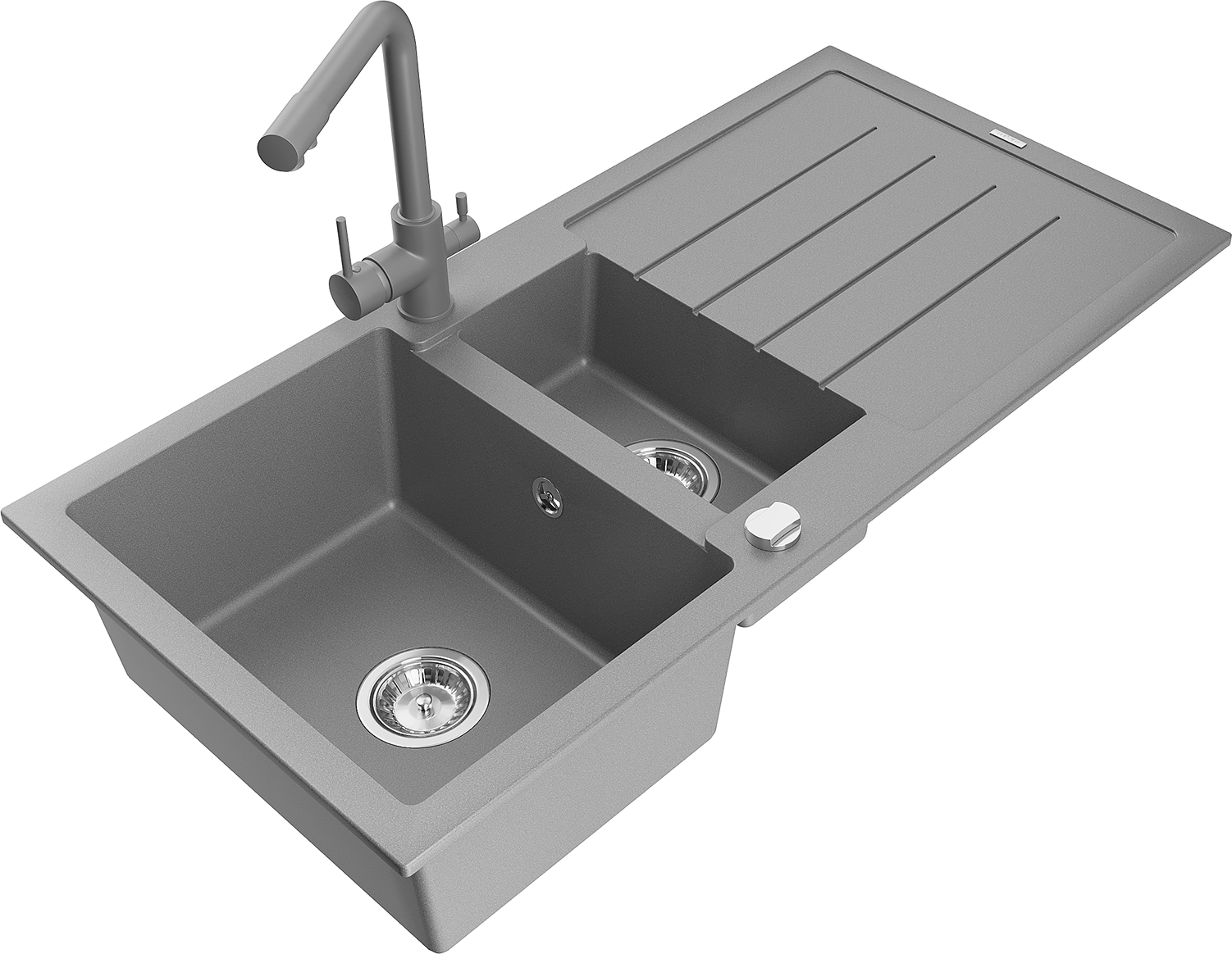 Mexen Andres évier en granit 1,5 bac avec égouttoir et robinet de cuisine Duero, gris - 6515-71-671600-71
