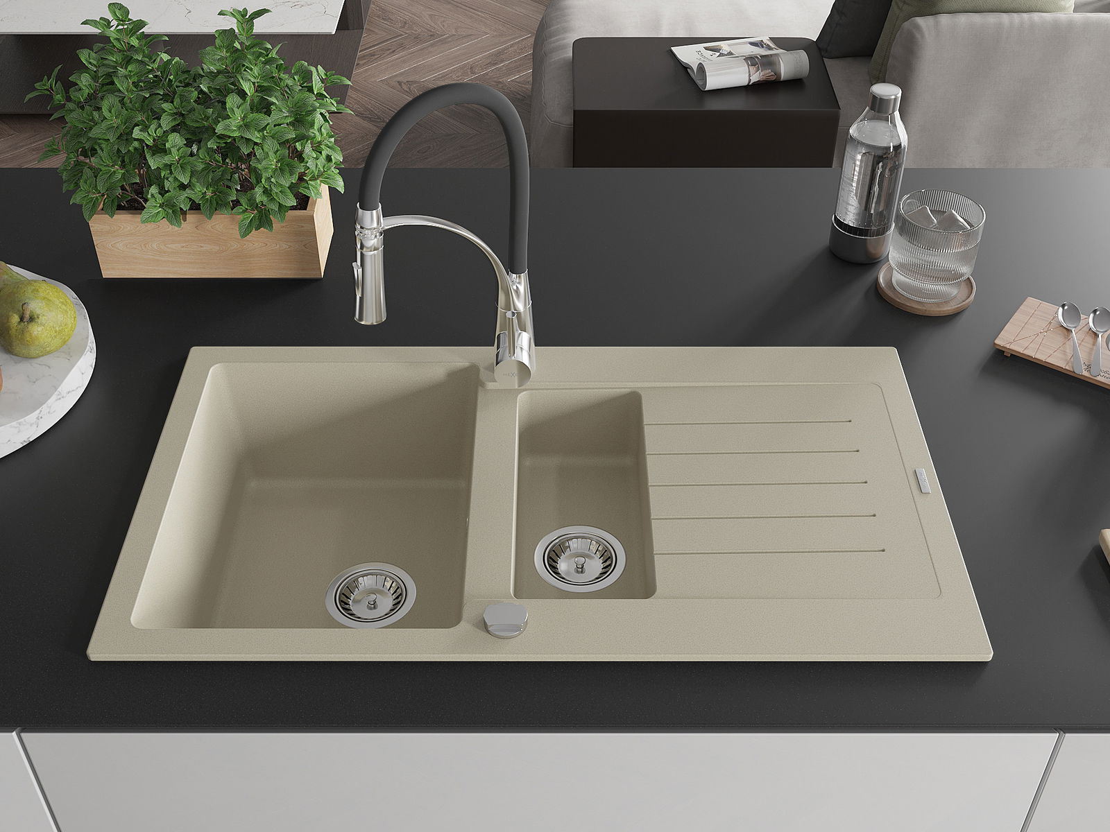 Mexen Matias évier en granit 1,5-bassin avec égouttoir et robinet de cuisine Aster, beige - 6502-69-73450-07