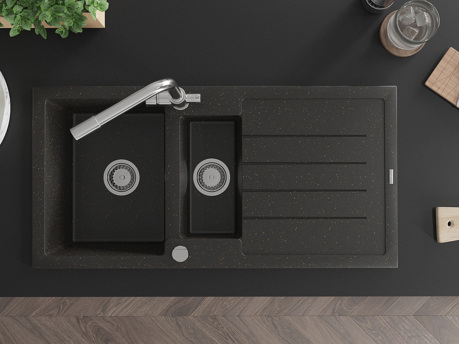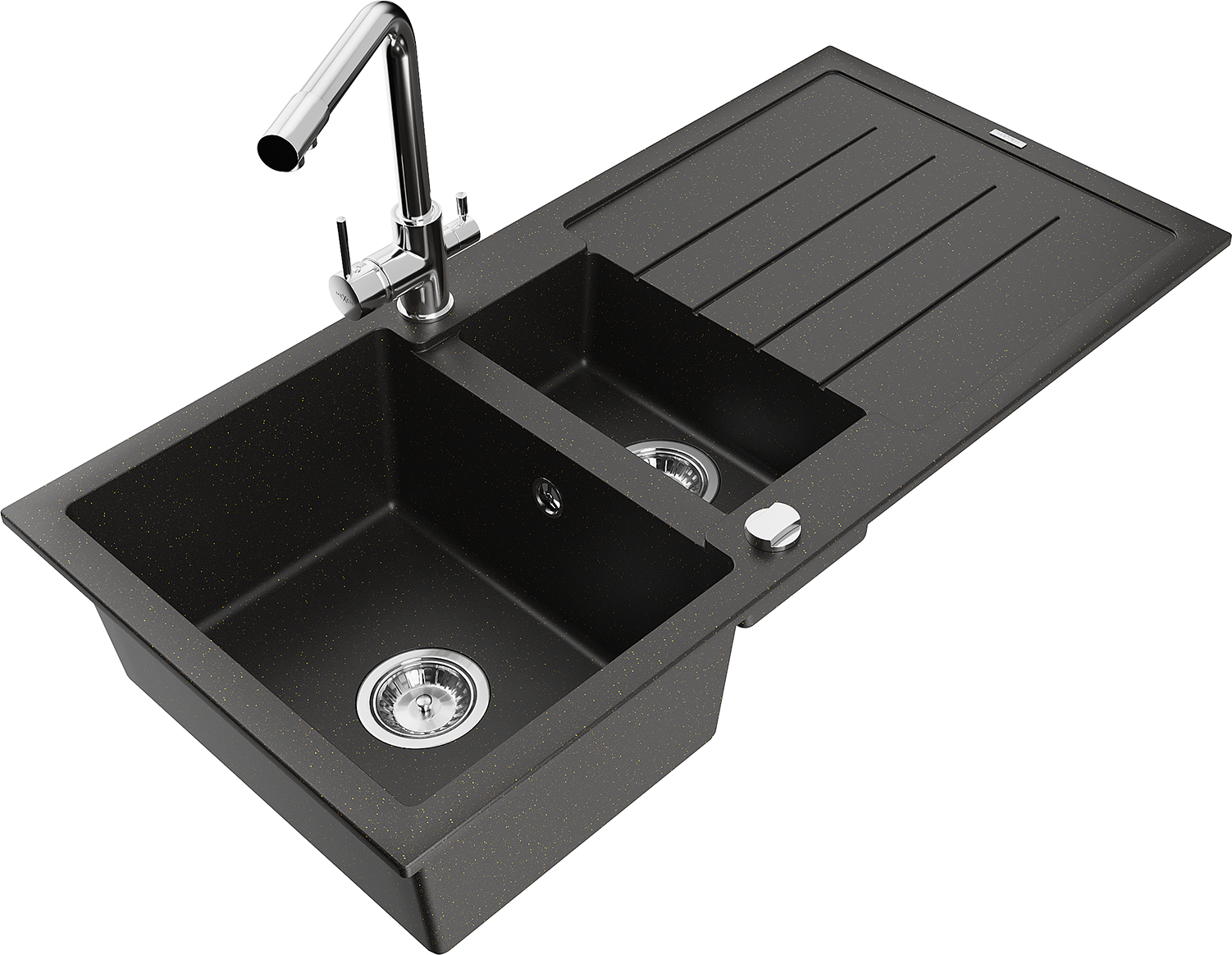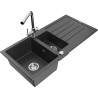 Mexen Andres évier en granit 1,5 bac avec égouttoir et robinet de cuisine Duero, noir/or - 6515-75-671600-00