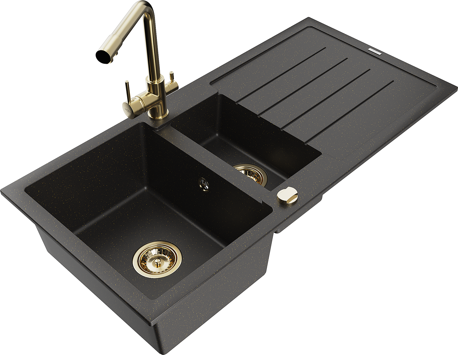 Mexen Andres évier en granit 1,5 bac avec égouttoir et robinet de cuisine Duero, noir/or - 6515-75-671600-50