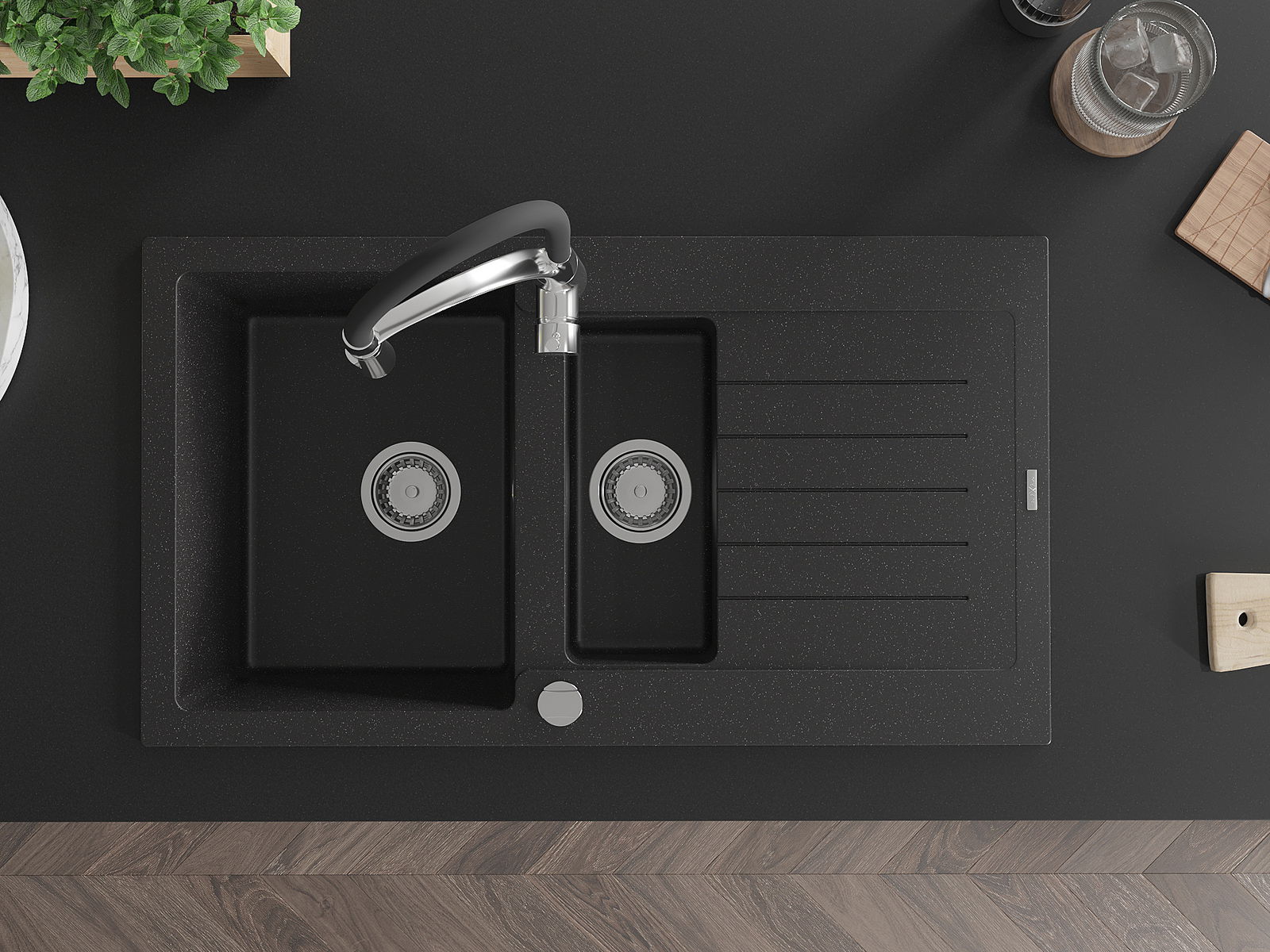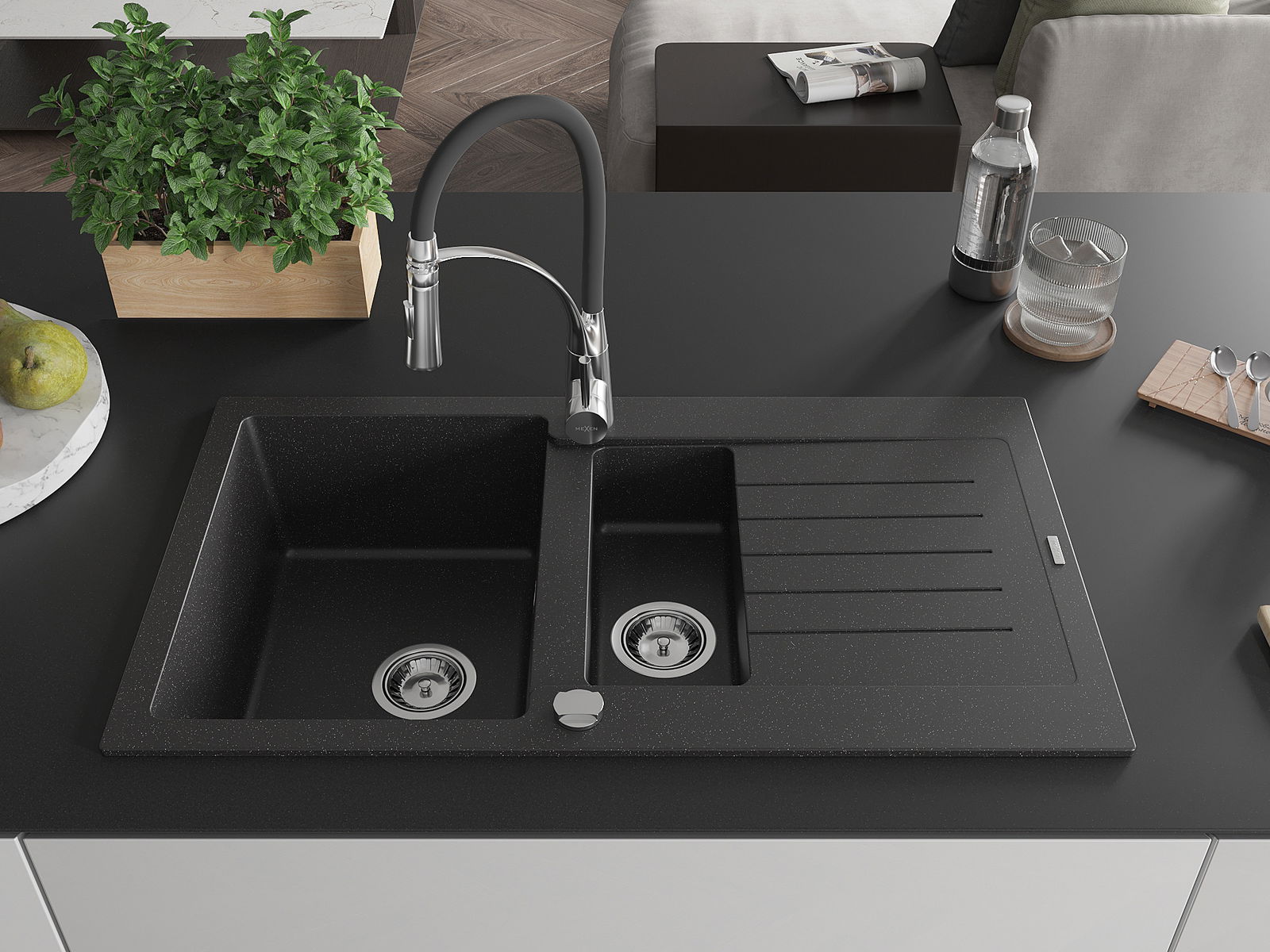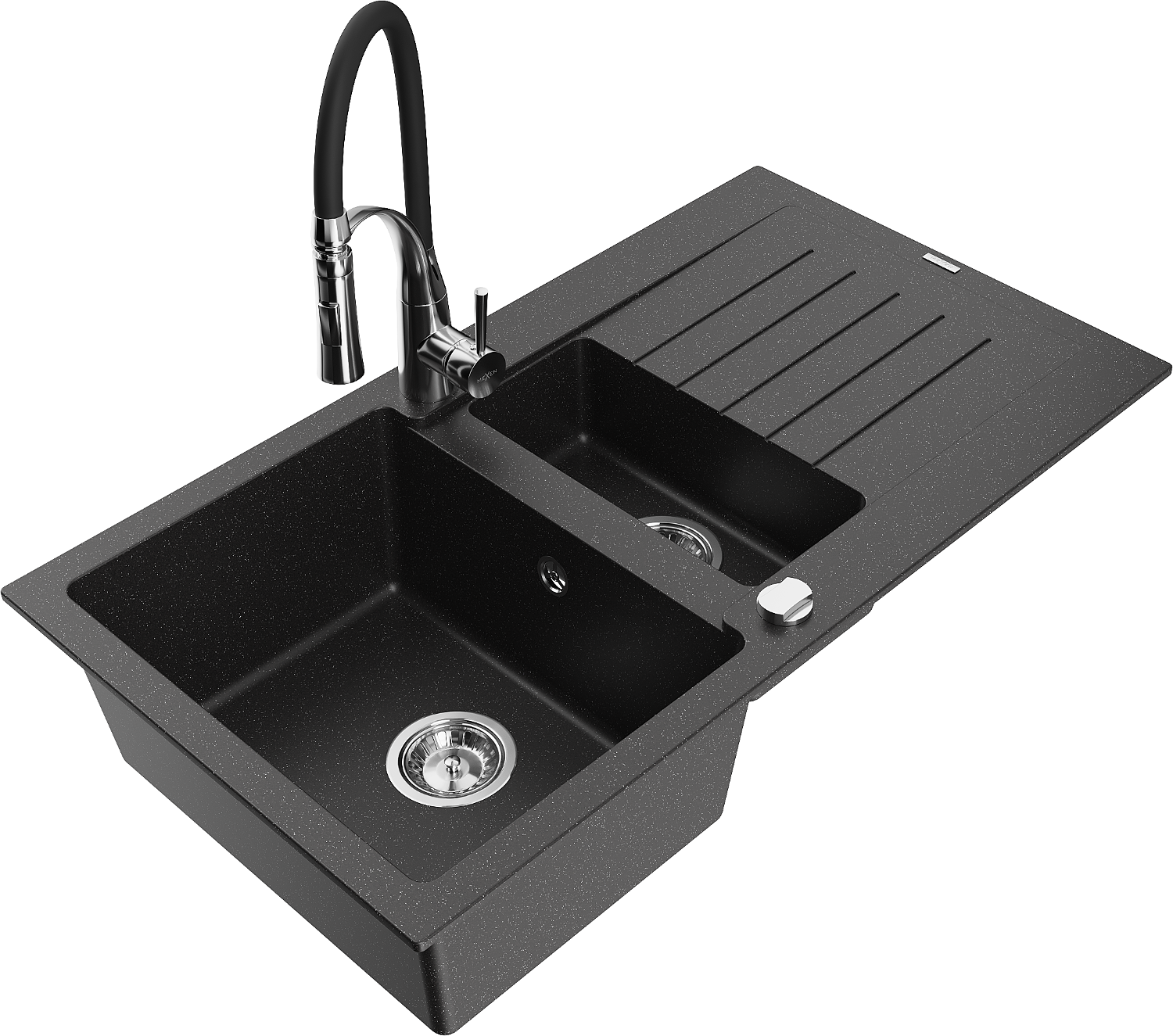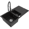 Mexen Matias évier en granit 1,5 bac avec égouttoir et robinet de cuisine Aster, noir/métallisé argent - 6502-73-73450-07