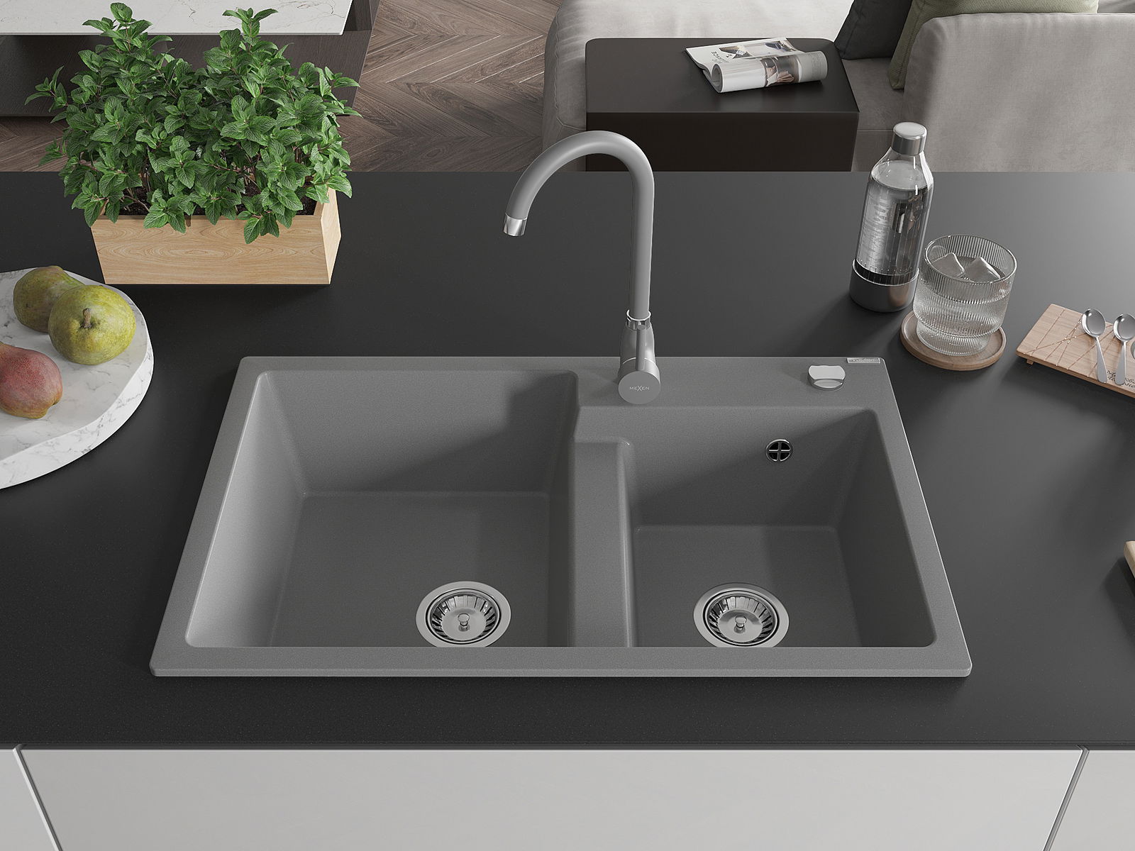 Mexen Tomas évier en granit à 2 bacs avec robinet de cuisine Telma, gris - 6516-71-670200-71