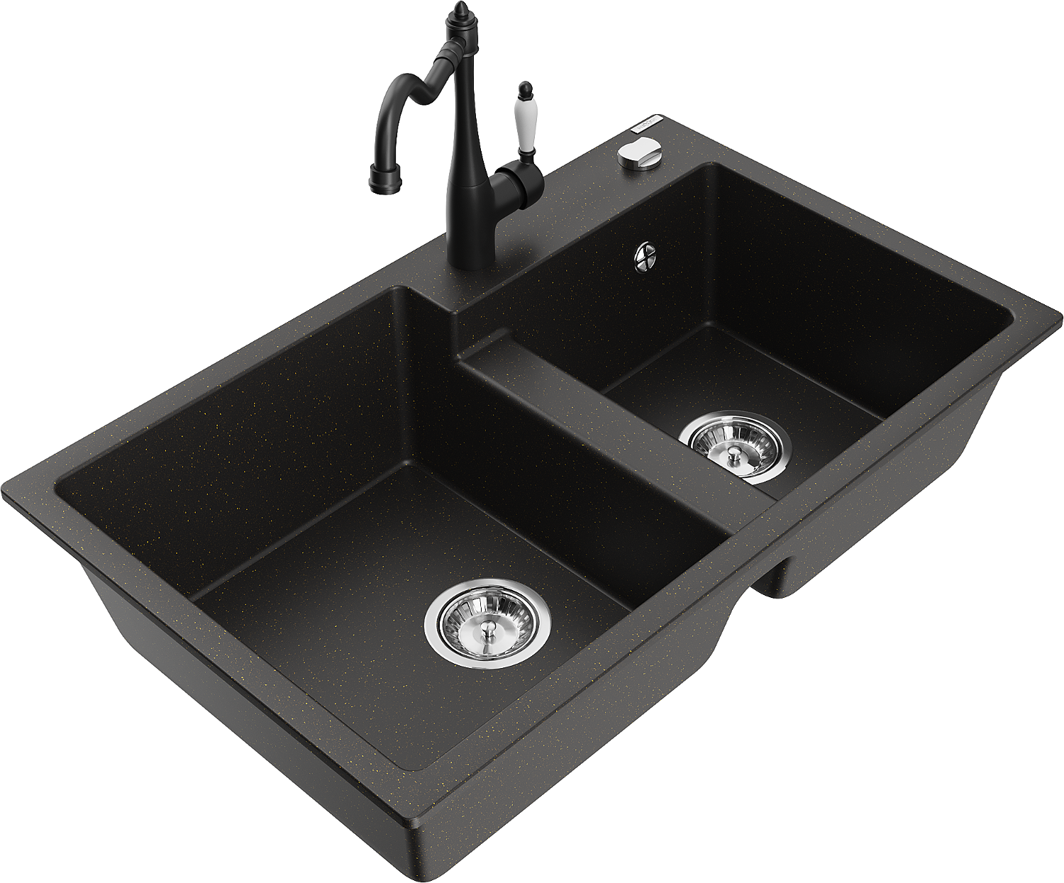 Mexen Tomas évier en granit à 2 bacs avec robinet de cuisine Carla, noir/doré métallisé - 6516-75-670700-70