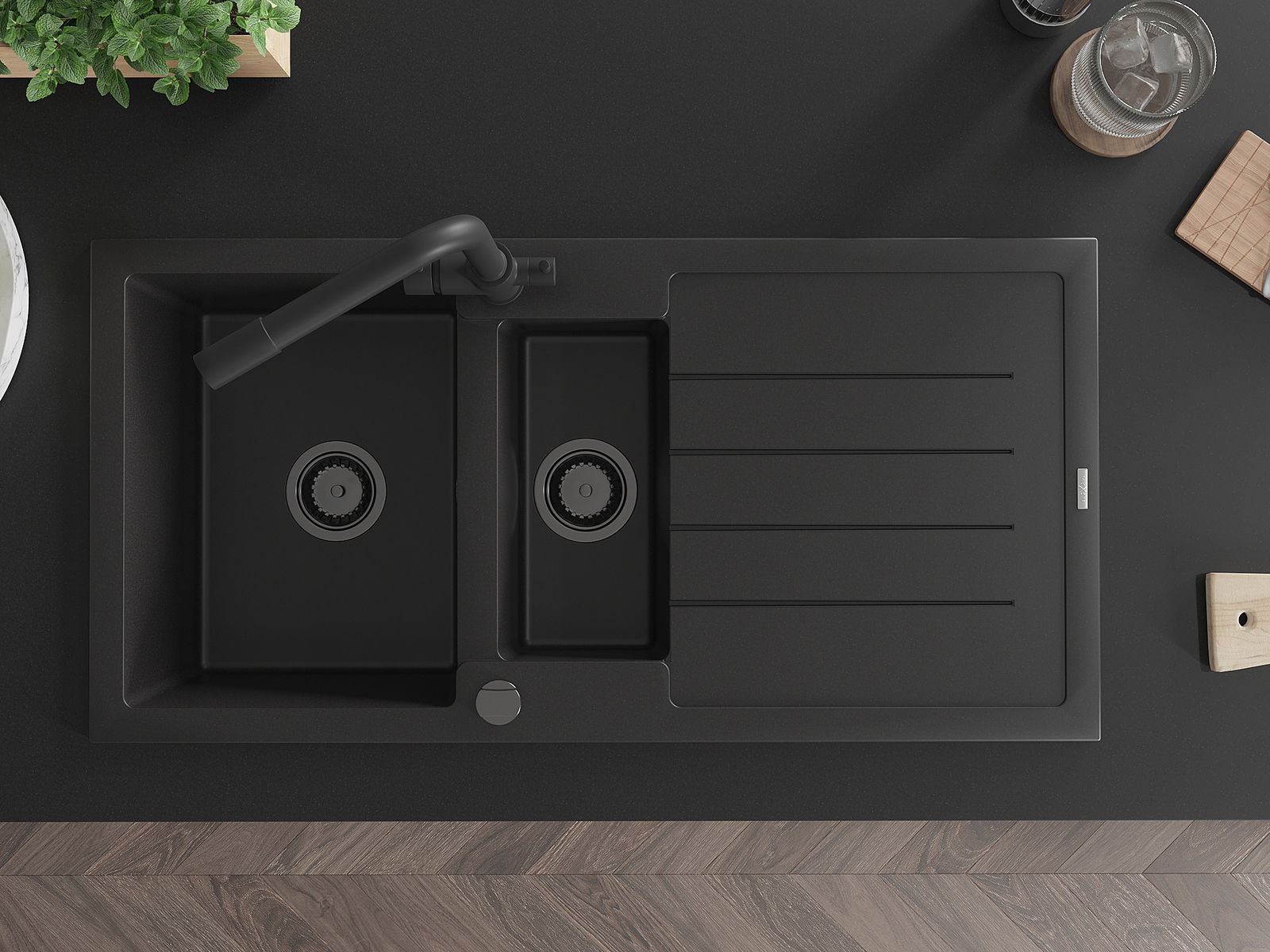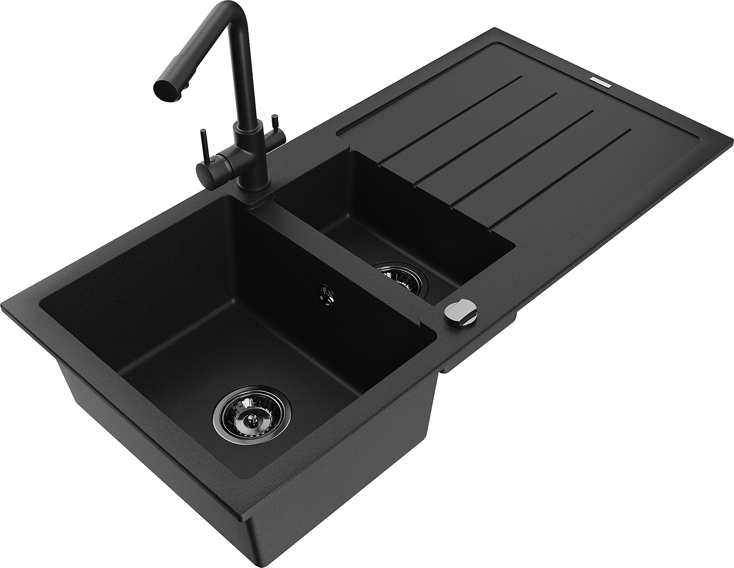 Mexen Andres évier en granit 1,5 bac avec égouttoir et robinet de cuisine Duero, noir - 6515-77-671600-70-B