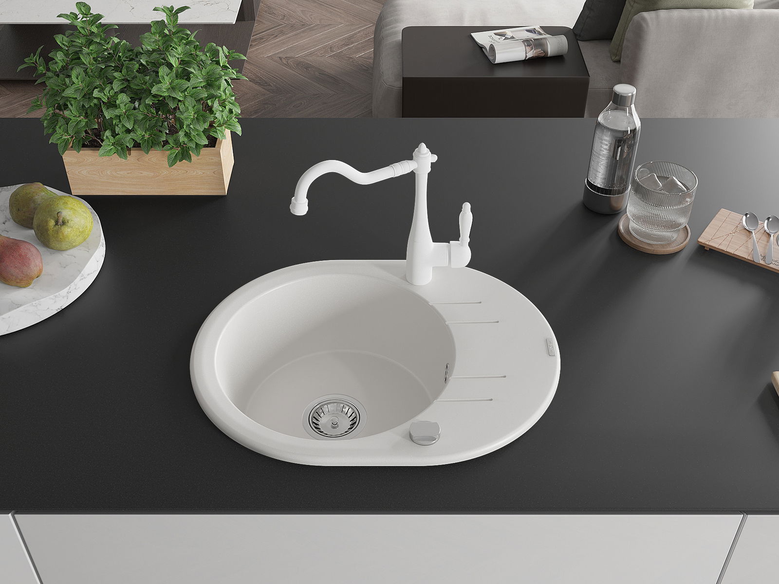 La surface de l'évier est résistante aux taches et aux décolorations, ce qui la rend facile à nettoyer et permet à sa couleur de rester intacte pendant longtemps. Un complément esthétique et pratique pour chaque cuisine.