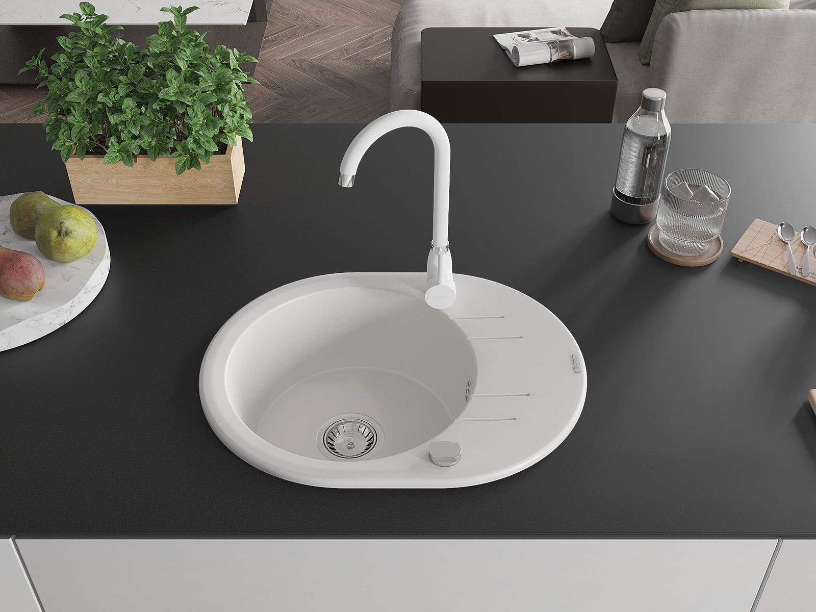 Mexen Kevin évier en granit 1 bac avec égouttoir et robinet de cuisine Telma, blanc - 6517-20-670200-20