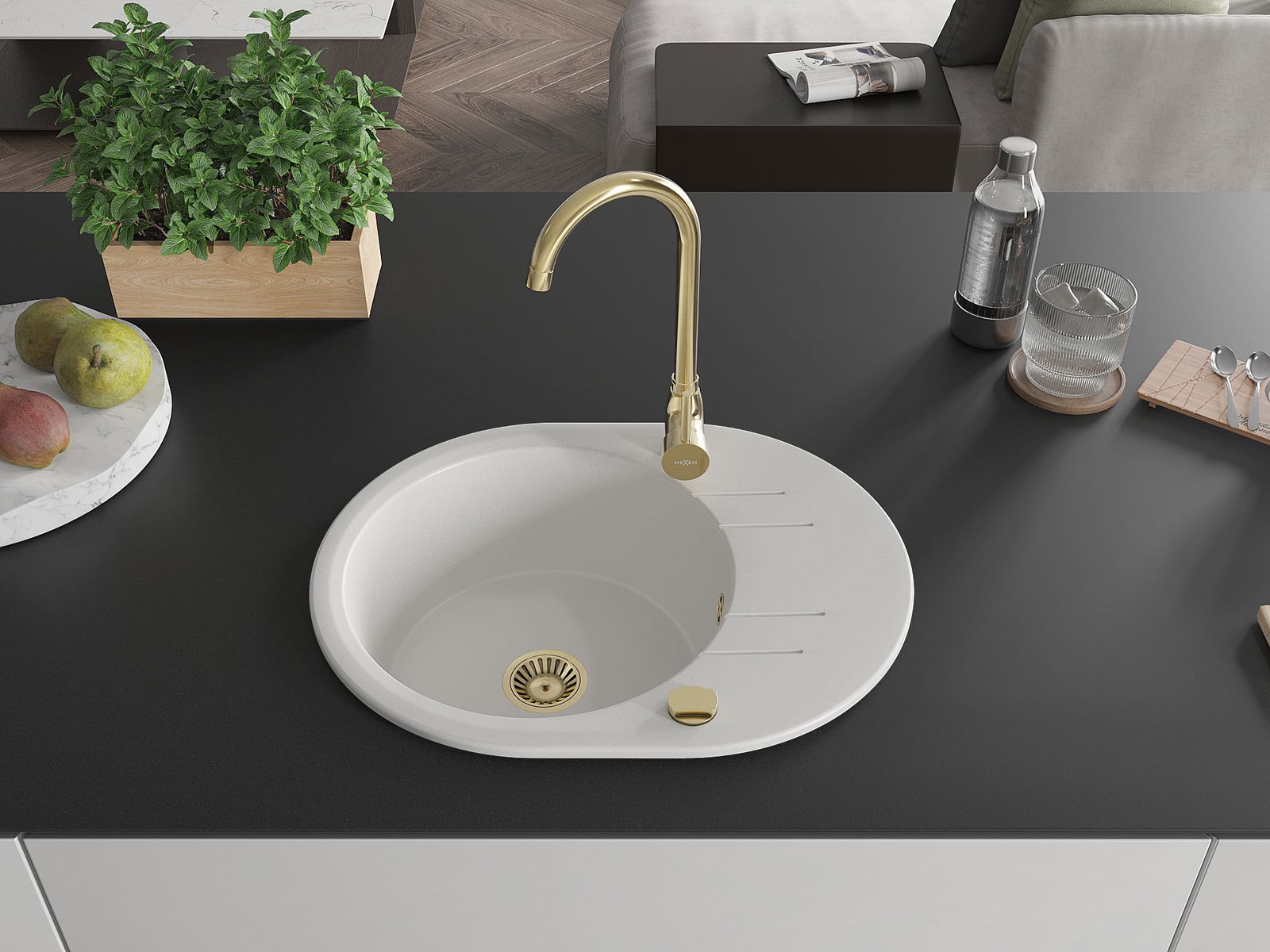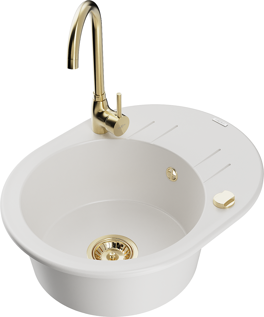 Mexen Kevin évier en granit 1 bac avec égouttoir et robinet de cuisine Telma, blanc - 6517-20-670200-50