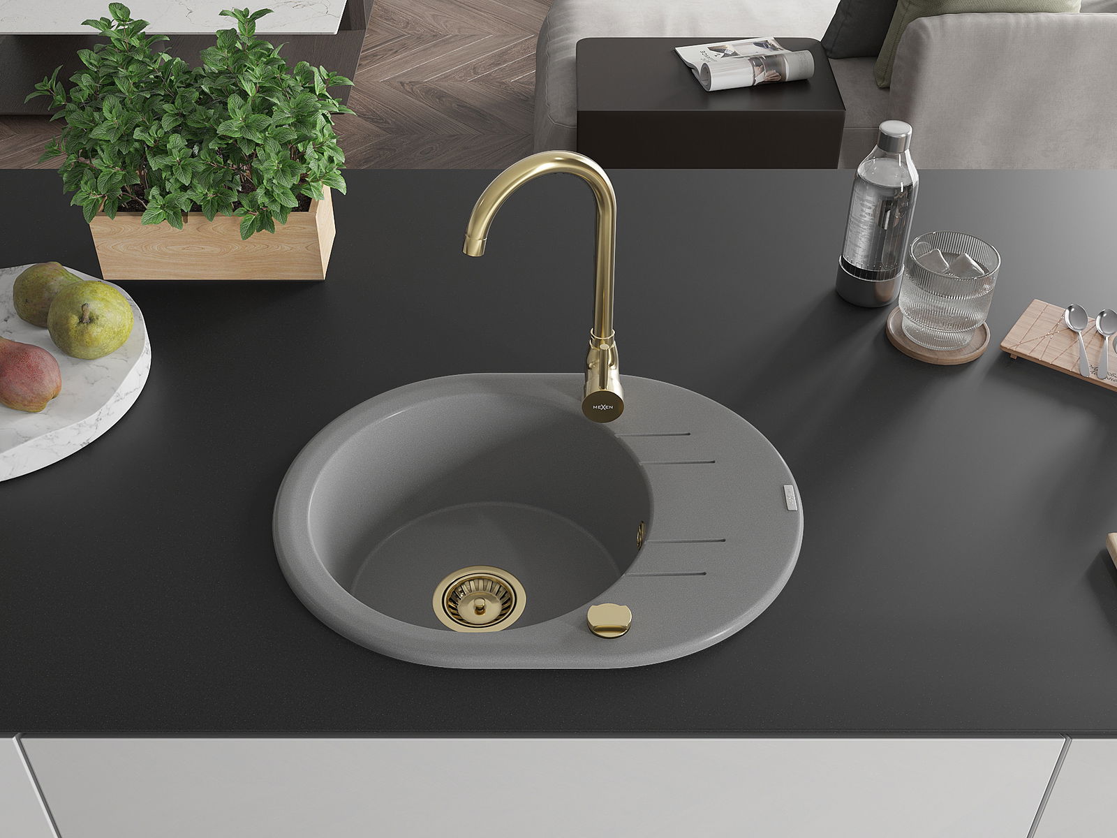 Mexen Kevin évier en granit 1 bac avec égouttoir et robinet de cuisine Telma, gris - 6517-71-670200-50