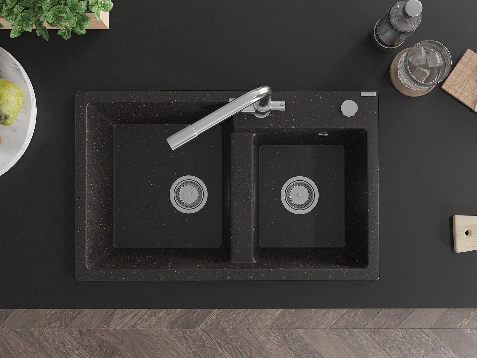 L'évier a un trou sous-meulé de 35 mm de diamètre à percer soi-même. Il peut être utilisé, entre autres, pour installer un distributeur de liquide, ce qui éliminera la présence de bouteilles en plastique dans la cuisine et lui donnera une finition élégante.